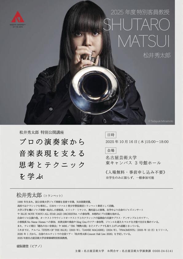 トランペット奏者であり、本学2025年度特別客員教授の松井秀太郎氏による特別公開講座「プロの演奏家から音楽表現を支える思考とテクニックを学ぶ」 が開催されます。
