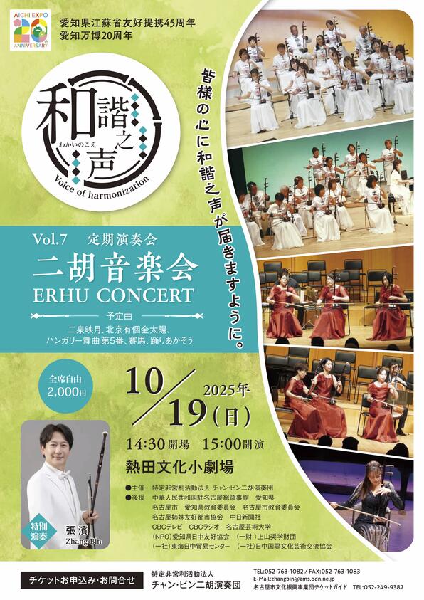 2025年10月19日(日)、特定非営利活動法人チャン・ビン二胡演奏団による「Vol.7 定期演奏会 二胡音楽会」が、熱田文化小劇場にて開催されます。