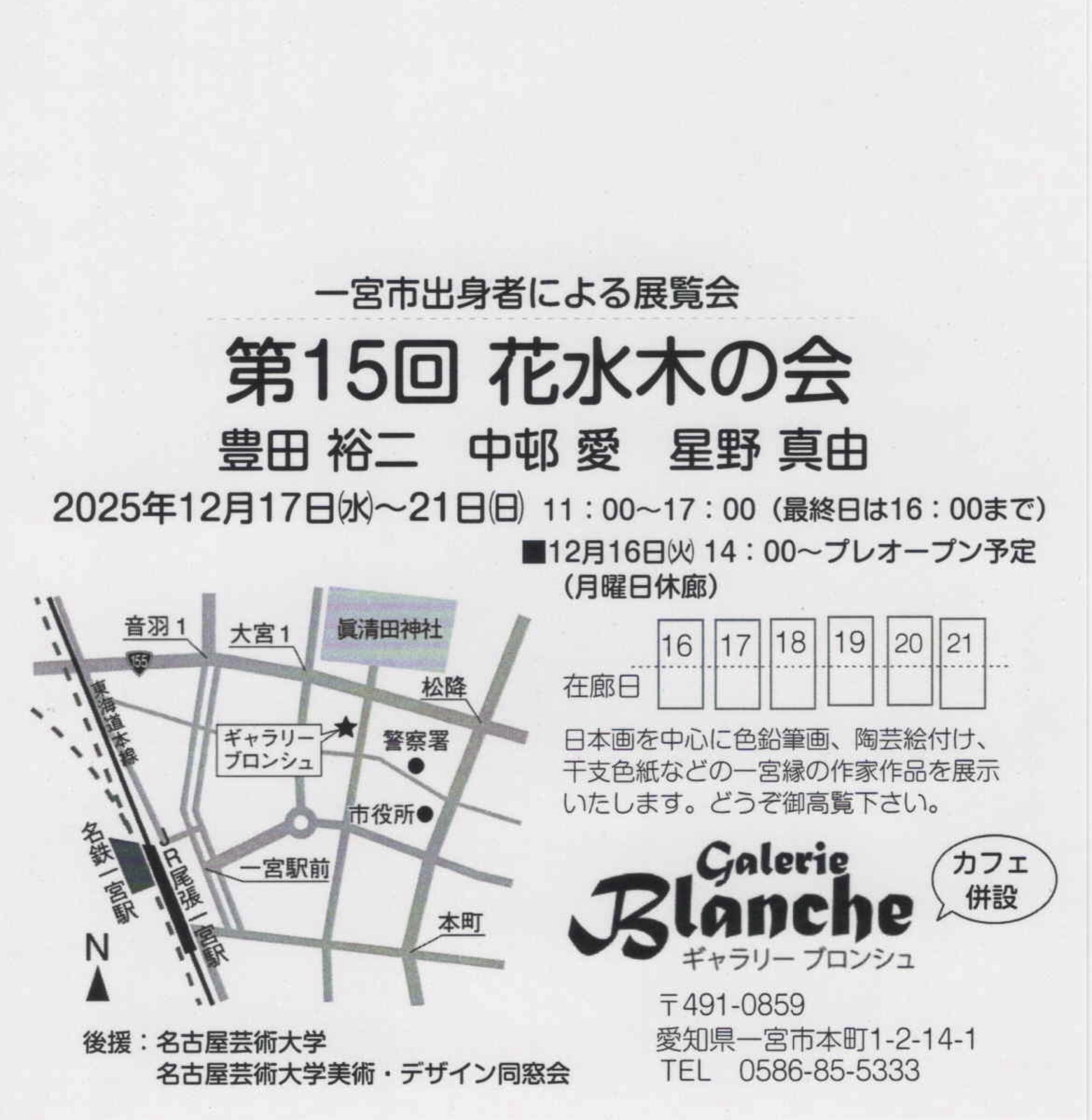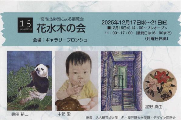 本学卒業生の 豊田裕二さん、中邨愛さん、星野真由さん による展覧会「第15回 花水木の会」が、愛知県一宮市のギャラリーブロンシュで開催されます。
