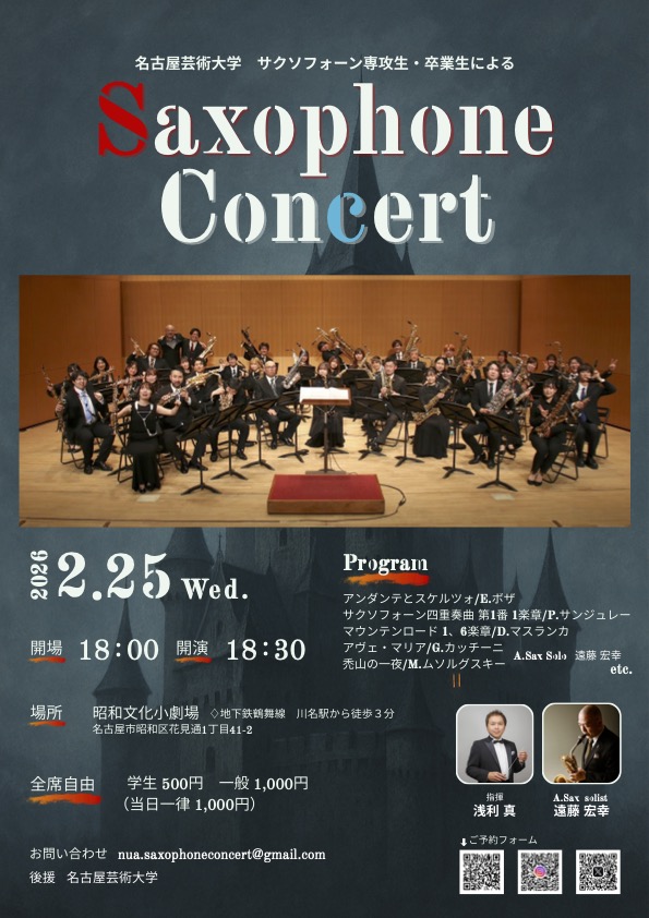 2026年2月25日(水) 名古屋芸術大学 サクソフォーン専攻生・卒業生による 「Saxophone Concert 」のご案内