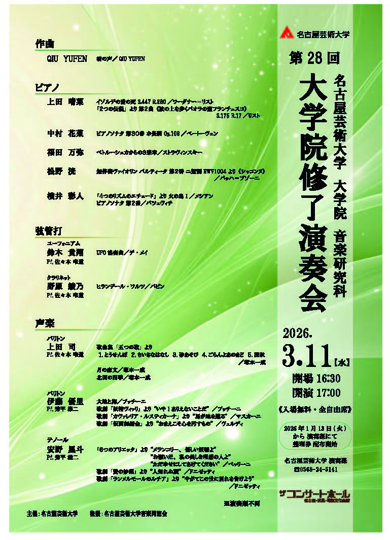 2026年3月11日(水)『名古屋芸術大学 大学院 音楽研究科 第28回 大学院修了演奏会』のご案内