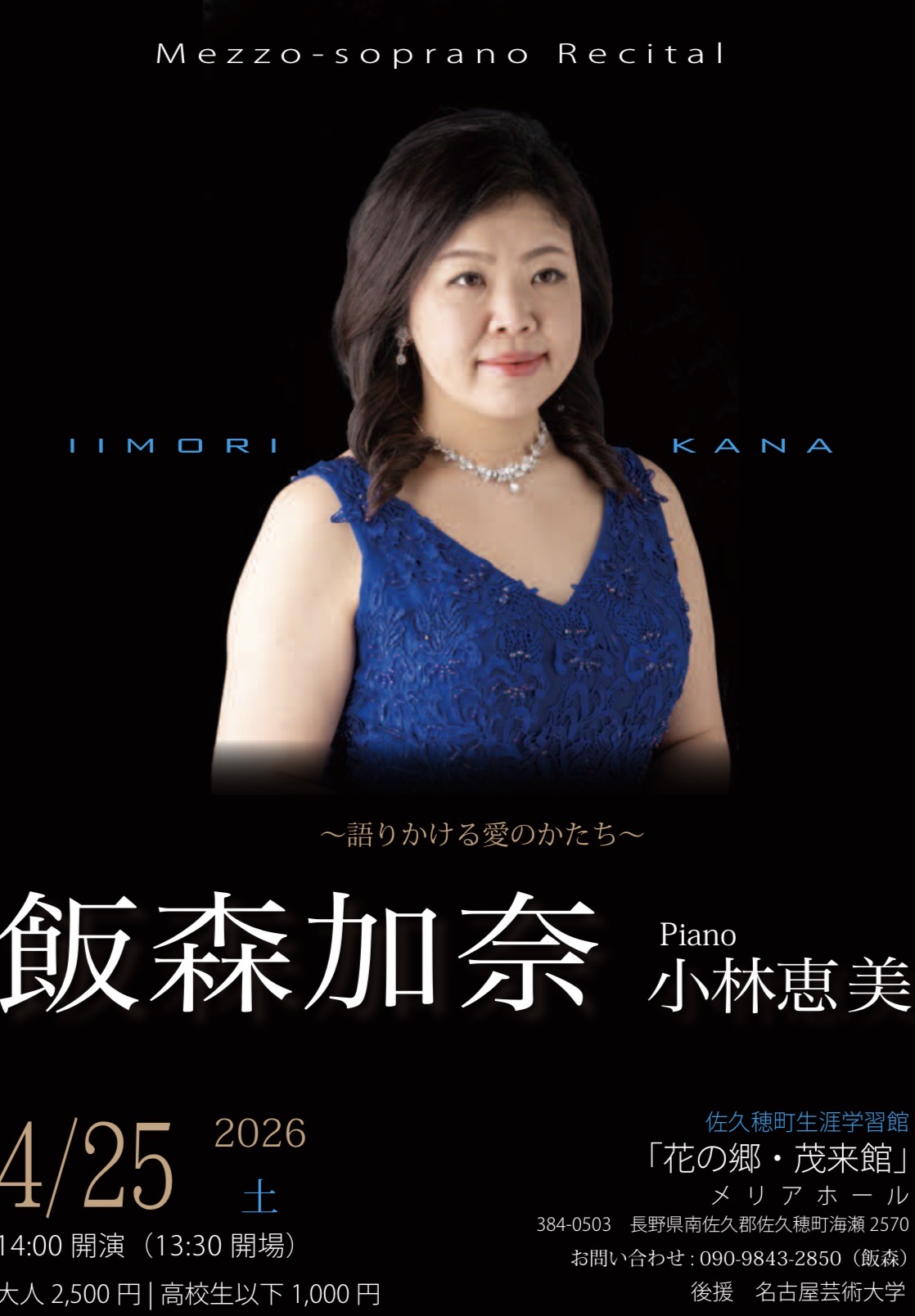 本学卒業生の飯森加奈さんによるメゾ・ソプラノリサイタル「語りかける愛のかたち」が、佐久穂町生涯学習館「花の郷・茂来館」メリアホールにて開催されます。