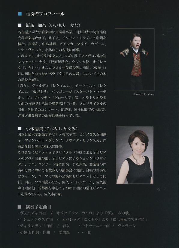 出演:飯森加奈(メゾ・ソプラノ)、小林恵美(ピアノ)