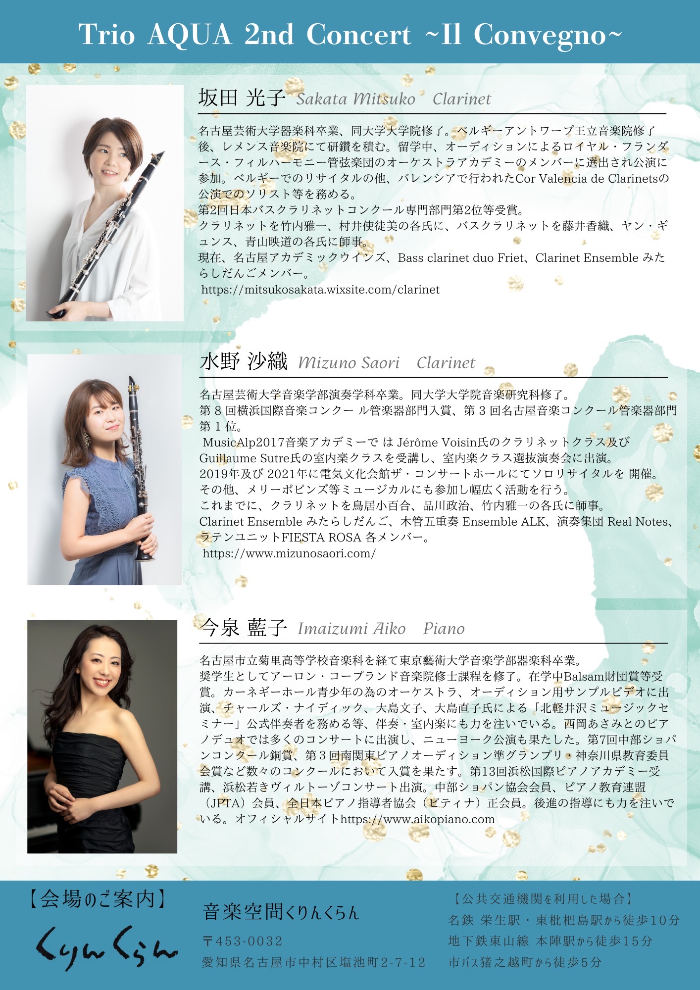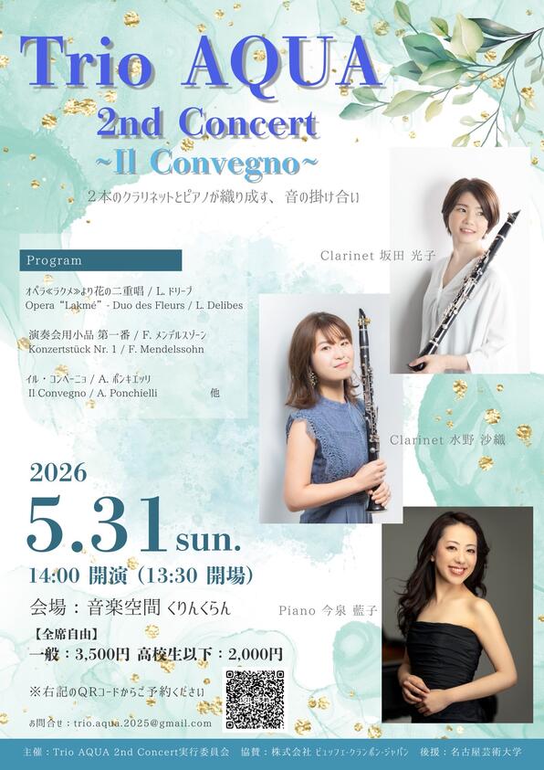 2026年5月31日(日)、本学卒業生の坂田光子さん・水野沙織さんが出演する室内楽公演「Trio AQUA 2nd Concert ~Il Convegno~」を、音楽空間 くりんくらんにて開催します。
