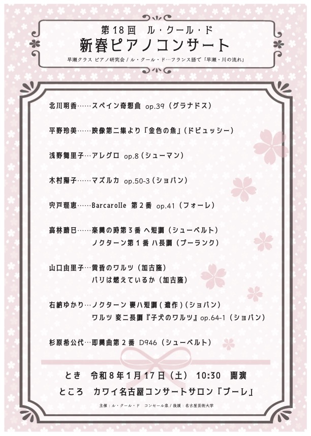 令和8年1月17日(土)、カワイ名古屋コンサートサロン「ブーレ」にて「第18回 ル・クール・ド 新春ピアノコンサート」を開催します。