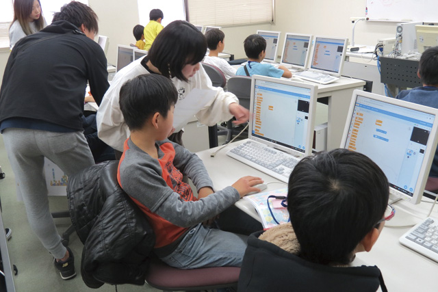 ブロックを組み合わせる感覚で簡単にプログラミングできるツールを使って、ゲーム作りを体験。子どもたちは夢中でパソコンに向かいました。もっともっとやりたかった、時間が足りないという声をたくさんいただきました。