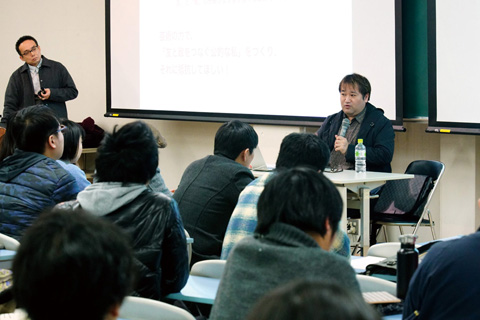 石鍋氏と山本氏はワンピース倶楽部の活動状況について、田中氏は、林氏と共に、ユニット『チーム・ガラパゴス』を作り、グループ展の企画や展覧会のカタログ制作、オルタナティブな展示スペースなどへのセルフビルド・サポートについて語りました。