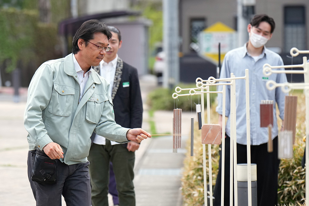 説明を終えたところで全員で屋外に移動、楽器を実演しました。木のバチを持ち歩きながらタイルを叩いていくと、見学者から思わず声が上がります。丸万商会 古田さんも「こんなきれいな音がするとは思わなかった」と驚いた様子。音を聞いてもらいプレゼンテーションは終了の予定でしたが、試してみたいと声があり、見学者がかわるがわるバチを手に音色を体験、好評を博しました。虎澤代表理事からも「タイル感謝祭でも、ぜひお客さんに観て欲しい」との声があり、急遽、タイル感謝祭でも展示することに決まりました。