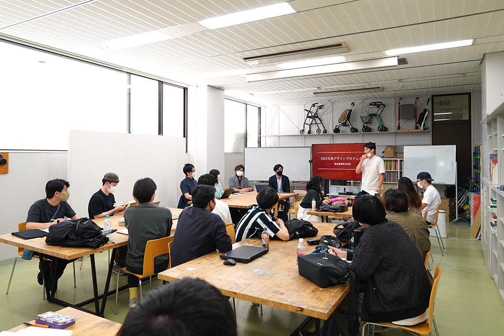 2022年6月8日、西キャンパス U102教室にて、本学と中部文具工業協同組合加盟の文具メーカーとの産学連携企画「2022 文具デザインプロジェクト」 1回目のミーティングと説明会を行いました。文具デザインプロジェクトは例年行われているもので、3年次までに習得したデザイン技術や知識を用い、商品や製品の企画、調査、開発、製造、販売までを見据えデザイン提案を行うもの。実際にこれまでの優秀作品が製品化されたこともあり、学生はもちろん企業にとっても非常に大きな意味を持つプロジェクトです。今年は、スタンプ・ネーム印でおなじみのシヤチハタ株式会社様、デスクマットやコロナ対策のパーティションなど樹脂製品の製造を行う森松産業株式会社様の2社に参加いただき、15名の学生が2社それぞれの課題に対し、デザインを提案することとなります。