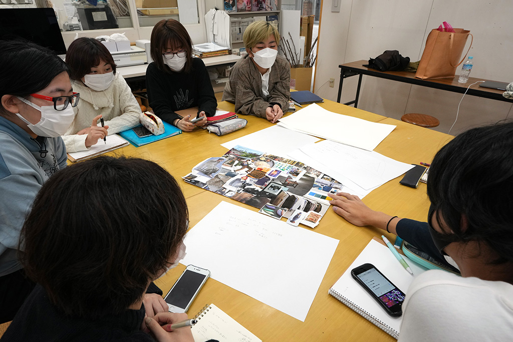 さて、演習ですが、前回までの授業でテキスタイルデザインコース2年生は2つのグループに分かれ、それぞれムードボード(アイデアやコンセプトを紙面上にまとめてコラージュしたもの)を作成、それぞれのグループが想定する顧客(バーチャルカスタマー)をディスカッションしています。これらを発表するところから始まりました。それぞれのグループでテーマとするカラーと3人のバーチャルカスタマーを説明します。例年、具体的に性別、年齢、生活の背景や消費性向などを想定するバーチャルカスタマーの説明が、学生らが考える時代や流行を反映していて興味深いのですが、今年は6名中4名が男性で、男性を強く意識したブランドとなり、これまでの手ぬぐいプロジェクトとは一風異なった展開となりました。