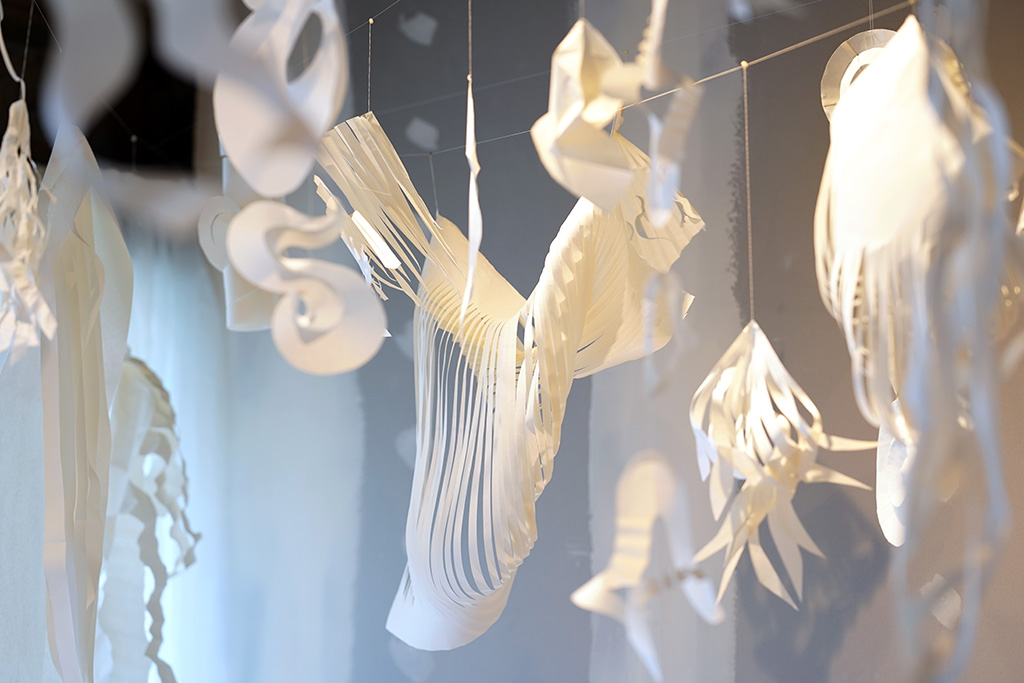 当日の朝、メタル&ジュエリーデザインコース3年生2名、1年生2名が会場を訪れ、天井から100を越えるオブジェを設置しました。設置してみると、空調で作品がゆるやかに揺れ、想像していた以上に有機的に見えます。照明の色合いも大きく影響し、白から電球色にするだけでも大きく印象が変わります。改めて無地白色の和紙の面白さを感じます。