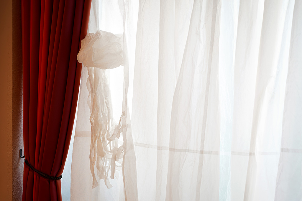 米山先生も、和紙をカーテンのようにした作品を展示。米山先生の作品といえば手漉き和紙を使った印象がありますが、今回はWashi-naryさんの機械抄きの薄い和紙を使ったもの。隣接するビルが迫る大きな窓が、自然光を取り込む柔らかな背景となりました。