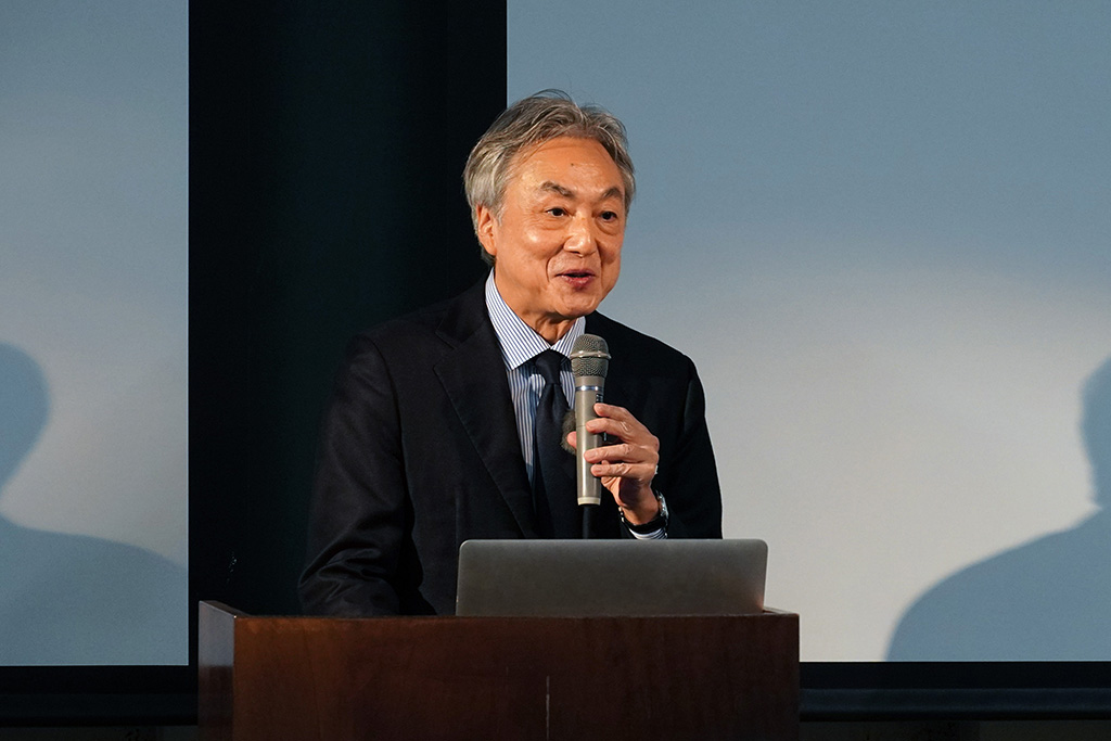 卒業制作展 50回記念講演会第1弾として、2023年2月7日(火)日本芸術院会員である画家 千住博さんをお迎えし「学生の皆さんに伝えたいこと/創造の現場より」という演目でお話しいただきました。千住氏は、1995年創立100周年のベネチア・ビエンナーレで東洋人初の名誉賞を受賞、以降イサム・ノグチ賞、恩賜賞、日本芸術院賞など数々の賞に輝きます。作品はメトロポリタン美術館、ブルックリン美術館、シカゴ美術館をはじめ、国内外の主要美術館、薬師寺、出雲大社などに収蔵され、高野山金剛峯寺、大徳寺聚光院の障壁画も担当するなど、現代を代表する日本画家であり、現代アート作家でもあります。