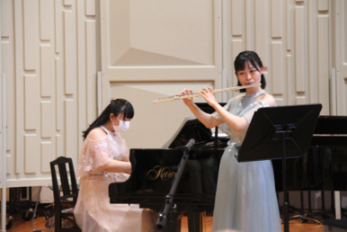 学生12組の出演となり(小学校教諭免許取得の為の科目等履修生2名含む)、約60名の地域の方々や在校生卒業生ご父兄を含む聴衆の前で、保育・教育者を目指す学生によるピアノ、声楽、フルート、エレクトーン演奏が行われました。