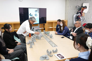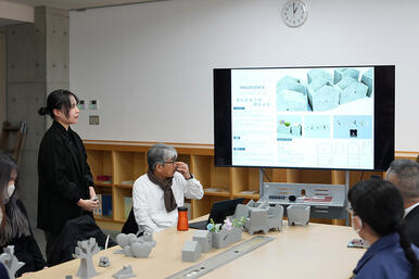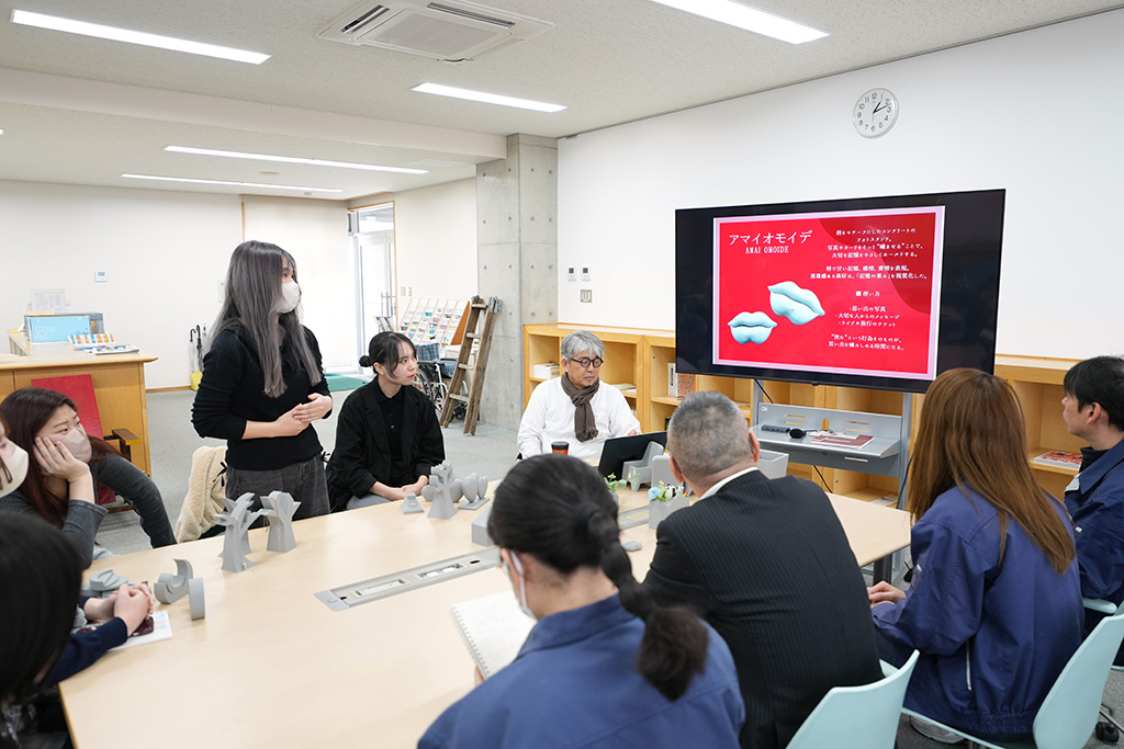 2026年2月17日には、2年生による新たなプロダクト提案プレゼンテーションを実施。学生は3Dプリンターで制作したモックアップを用い、アクセサリースタンドやアロマディフューザー、フォトスタンドなど、コンクリートの質感や重量感を生かした多様なアイデアを提案しました。当日は「成形できる形状か」「打設面や型抜き方向はどうするか」など、製造を見据えた具体的な議論も交わされ、企業と学生が一体となって実現可能性を探る機会となりました。