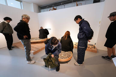 プレゼン後は、フジプレコンの皆様が卒業制作展を見学し、作品を通じた交流も行われました。余剰コンクリートという社会課題を起点に、素材理解から造形・製造・商品化の可能性までを探る本取り組みは、デザインと産業を結ぶ実践的な学びの場となっています。