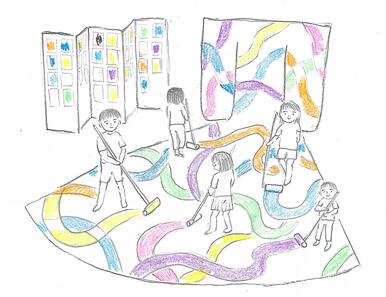 紙の振袖に、毛糸や梱包材を巻いたローラーで模様を描き、子どもたちの“願い”を込めた一着をつくる参加型プログラム。