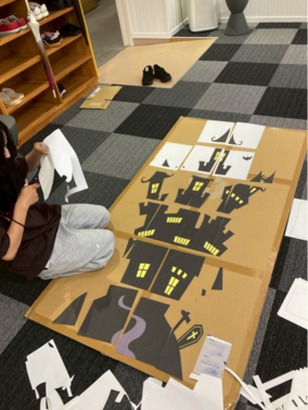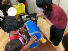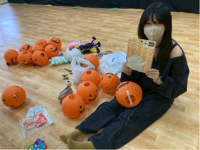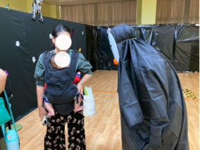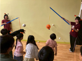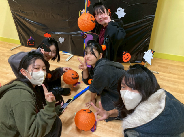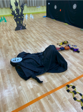 当日は、子ども健康・スポーツゼミの学生13名に加え、他ゼミから1名の学生を含む計14名が、ハロウィンにちなんだオリジナル運動プログラム「ゴーストバスターズ」を担当。鬼ごっこや宝探し、ピニャータ(的当て)などの要素を組み合わせた内容で、約300名の子どもたちが元気いっぱいに楽しむ姿が見られました。