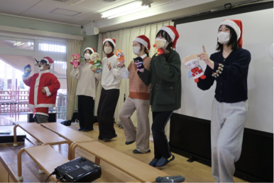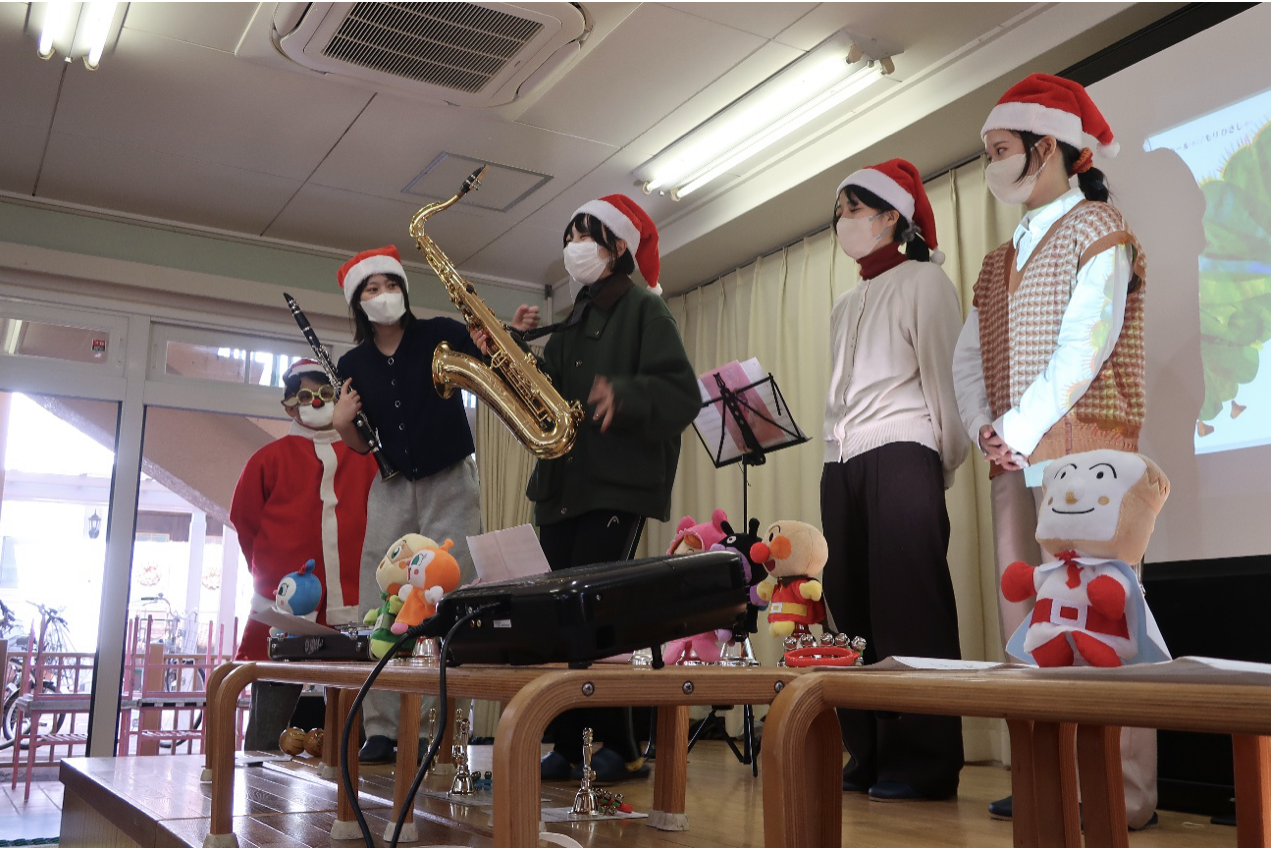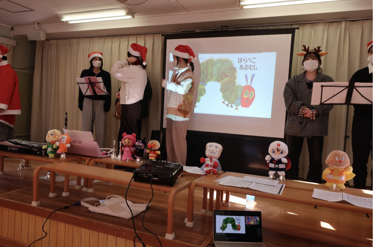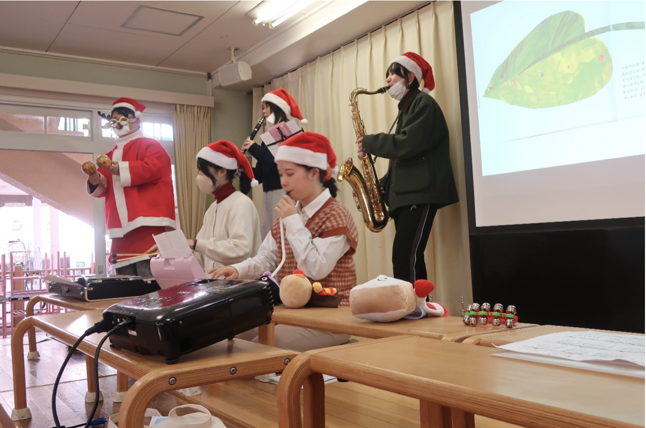 学生は『もろびとこぞりて・きよしこのよる』のハンドベル演奏、『はらぺこあおむし』をスクリーンに映し歌とピアノ・サックス・クラリネット演奏、最後に『サンサン体操』のリズムに合わせて園児全員と楽しく踊りました。