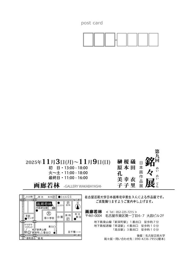 名古屋芸術大学日本画専攻卒業生によるグループ展 「第九回 銘々展」 が、2025年11月3日(月)から11月9日(日)まで、名古屋市東区の画廊若林にて開催されます。