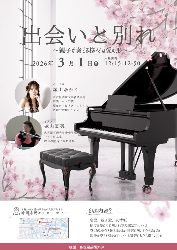 名古屋芸術大学の卒業生である親子2名による、ボーカルとピアノのコンサートを開催します。