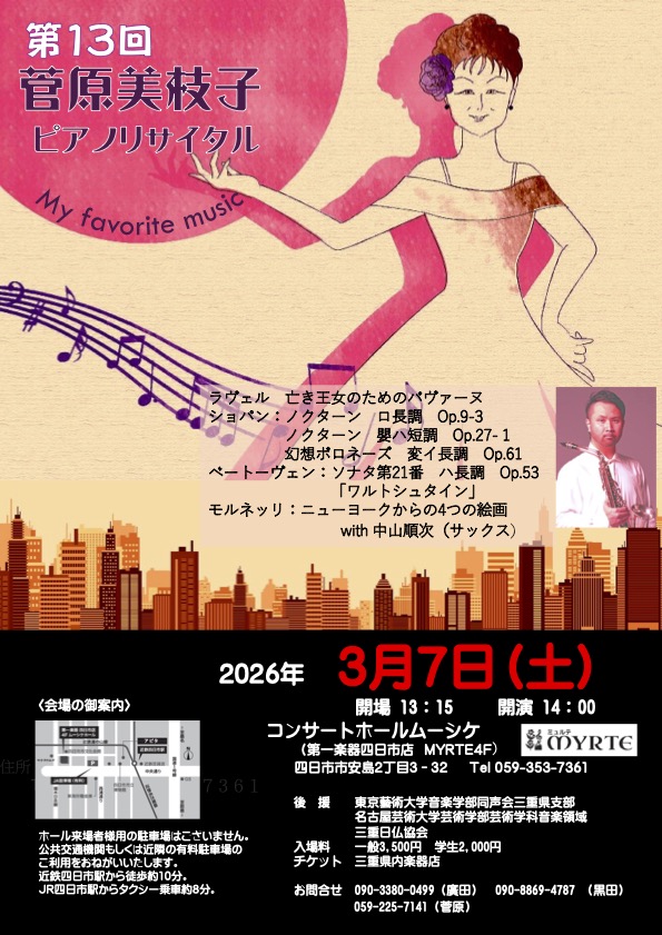 2026年3月7日(土) 第13回 菅原美枝子 ピアノリサイタル「My favorite music」のご案内