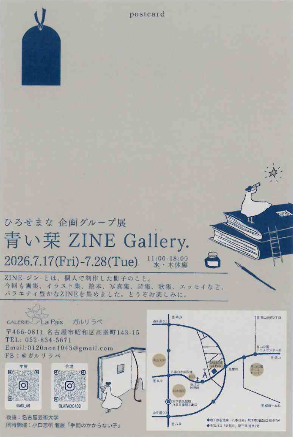 2026年7月17日(金)から7月28日(火)まで、本学卒業生の広瀬真愛さんが企画するグループ展「青い栞 ZINE Gallery.vol.8」を、GALERIE La Paix(ガルリラベ)にて開催します。