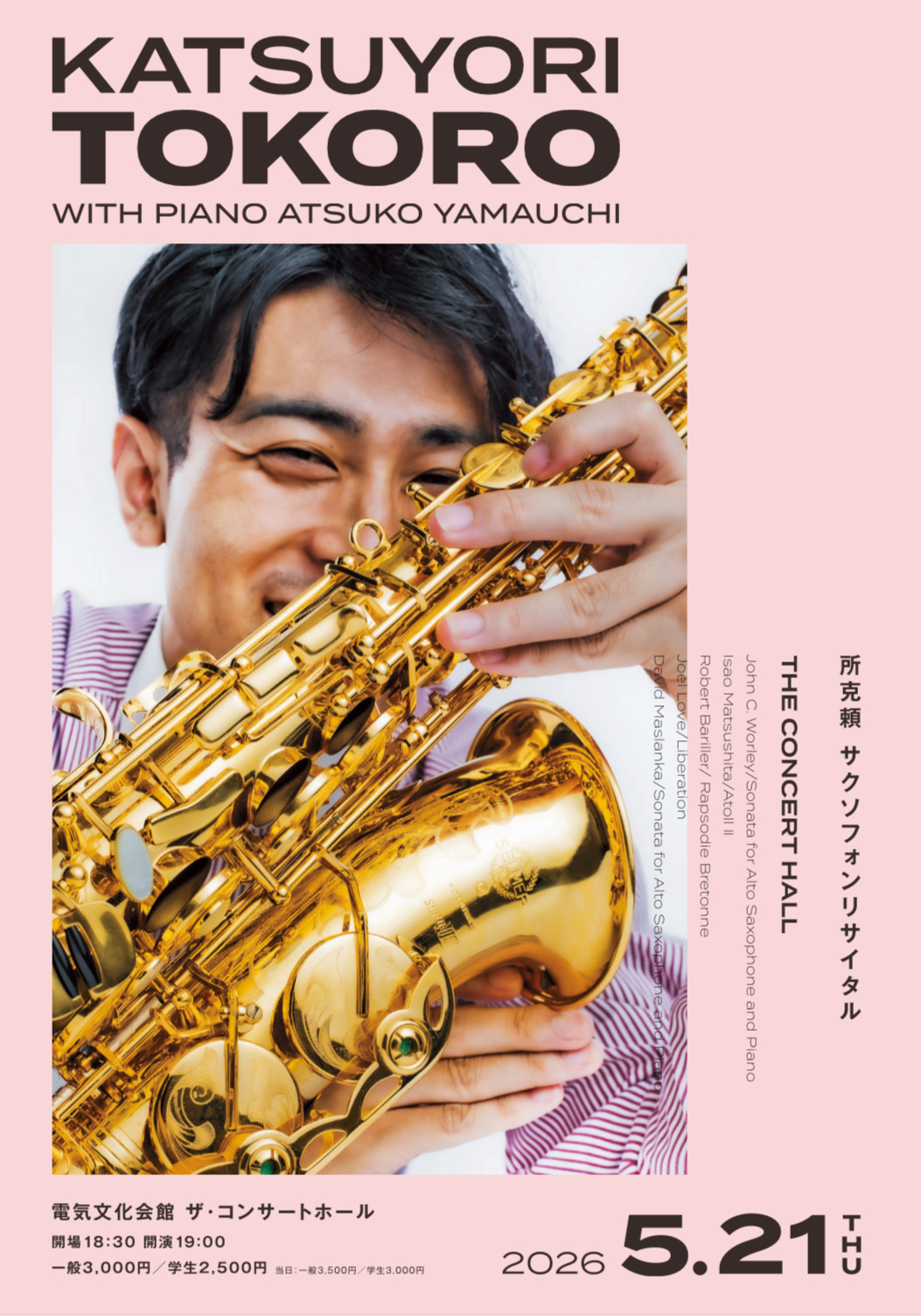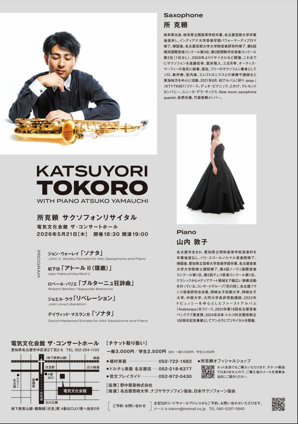 所克頼 サクソフォンリサイタル 『KATSUYORI TOKORO with Piano ATSUKO YAMAUCHI』のご案内