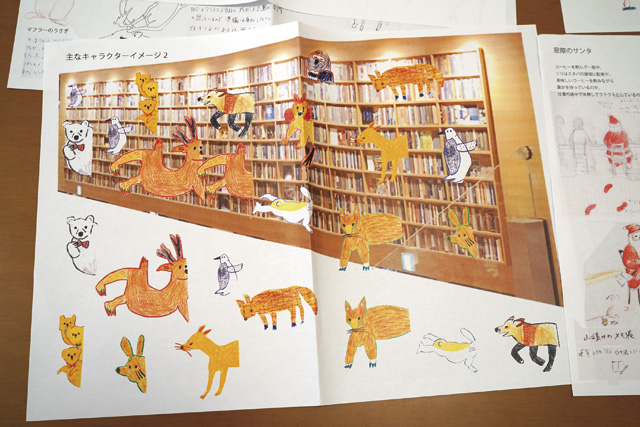 店舗では、あまり大きなものを飾るスペースがなく、つり下げも難しいと制約がいくつかありました。学生たちは、条件の中、窓や本棚、店内の照明や床など、さまざまなものへ装飾を施すアイデアを数多く考えました。表現としても、最初にあまりにクリスマスっぽいものよりも動物たちが本棚から飛び出しているというアイデアがあり、それを軸にサンタクロースがカフェでくつろいでいたら面白い、とたくさんのアイデアが出されました。サンタクロースが道に迷ってカフェで地図を広げているといったことも考えましたが、最終的には道に迷っているのかもしれないし、仕事をサボっているのかもしれないと、見る人に想像させる余地を残すようなものになりました。