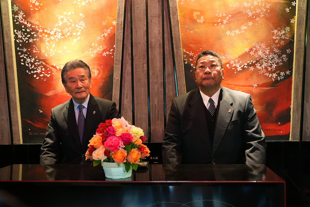 古川理事長からは「過去、名古屋芸術大学の先生方にはお世話になっておりまして2000年に始めた若手作家展シリーズの第一回に長谷川喜久先生、瀬永能雅先生にご出展いただいたように記憶しております(2000年「岩絵の具の可能性を求めて~名古屋発、若手作家からの提言」)。今では教授としてご指導いただいているかと思うと感慨深く、また、今日でも展覧会などでお世話になりご縁が深いなと感じております。現在、国内外さまざまなことが起きています。天災、パンデミック、さらに理不尽な戦争……、そうした今だからこそ芸術文化というものが一層大切に思われます。名古屋芸術大学に少しでもお役に立てれば、これまで以上に協力しあえればと思っております」とお言葉をいただきました。