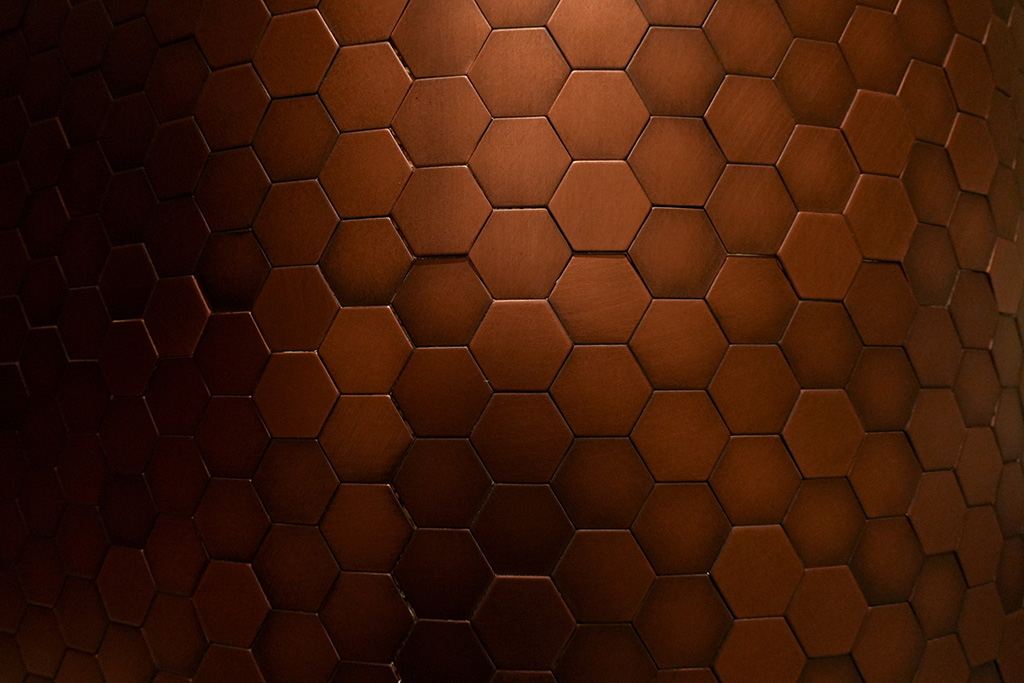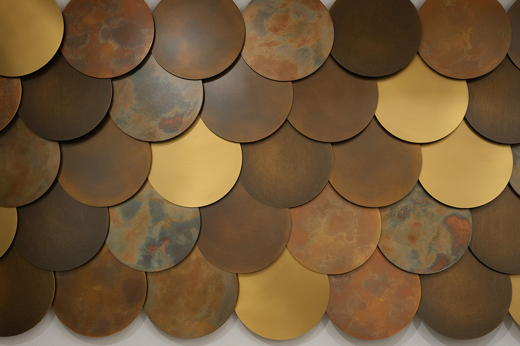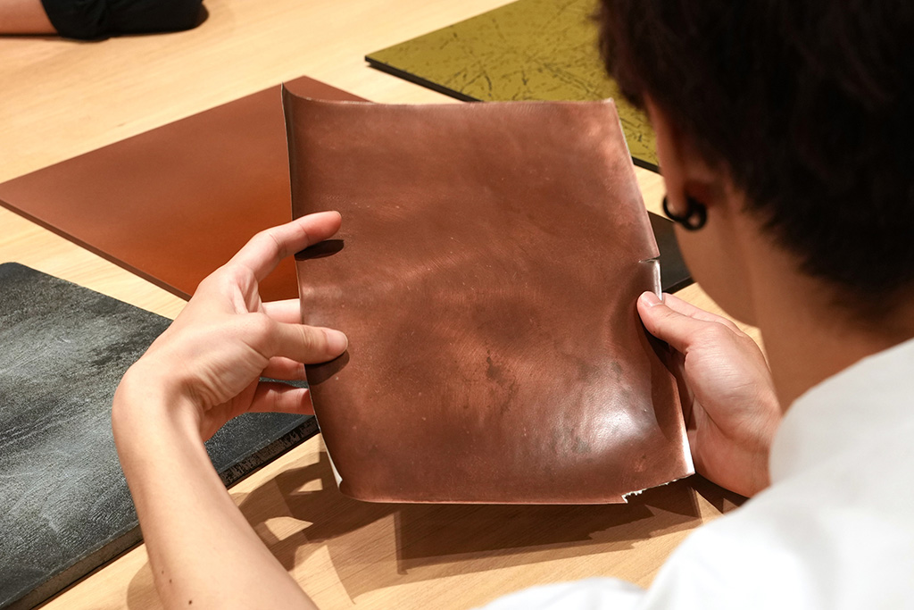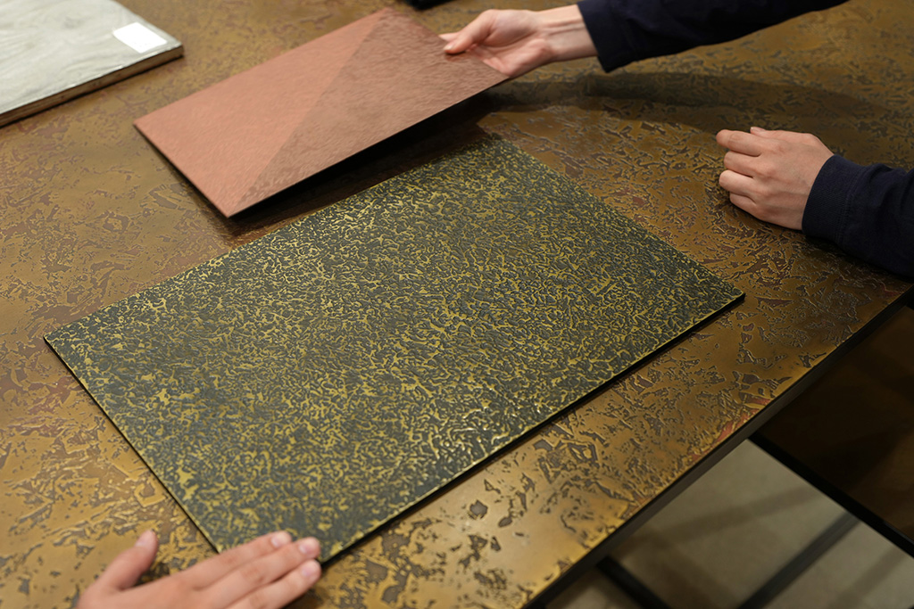 「金属粉・樹脂・硬化剤を混ぜた特殊塗料を木材や紙などに塗布し、研磨によって金属層を表出させることで、本物の金属と変わらない質感や重量感を得ることができます。鉄や銅、真鍮、錫など、金属それぞれの特性を活かせる塗料です。触れたときの感触や経年変化も再現でき、単なる塗装ではなく“素材としての金属”の魅力を持っています」と川中さんは語ります。