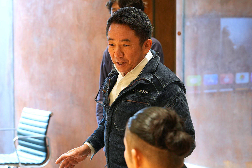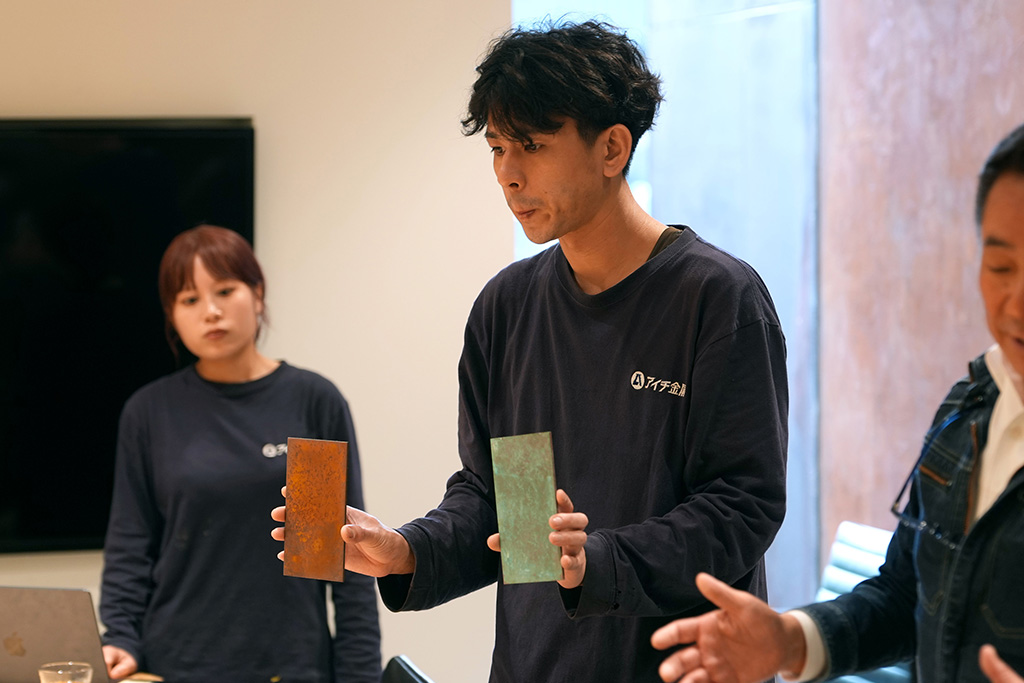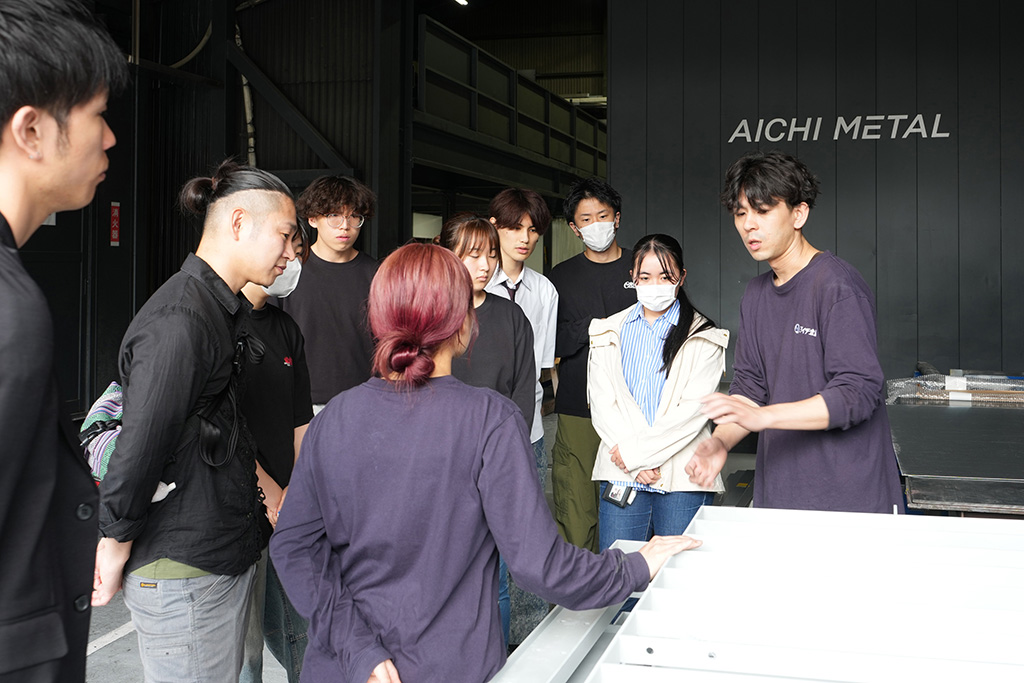 本プロジェクトの核となるのは、アイチ金属が展開するメタルサーフェス技術です。キックオフとして、2025年6月11日(水)、プロジェクトに参加する学生たちがアイチ金属を訪問。技術説明を受けたのち、工場見学を行いました。