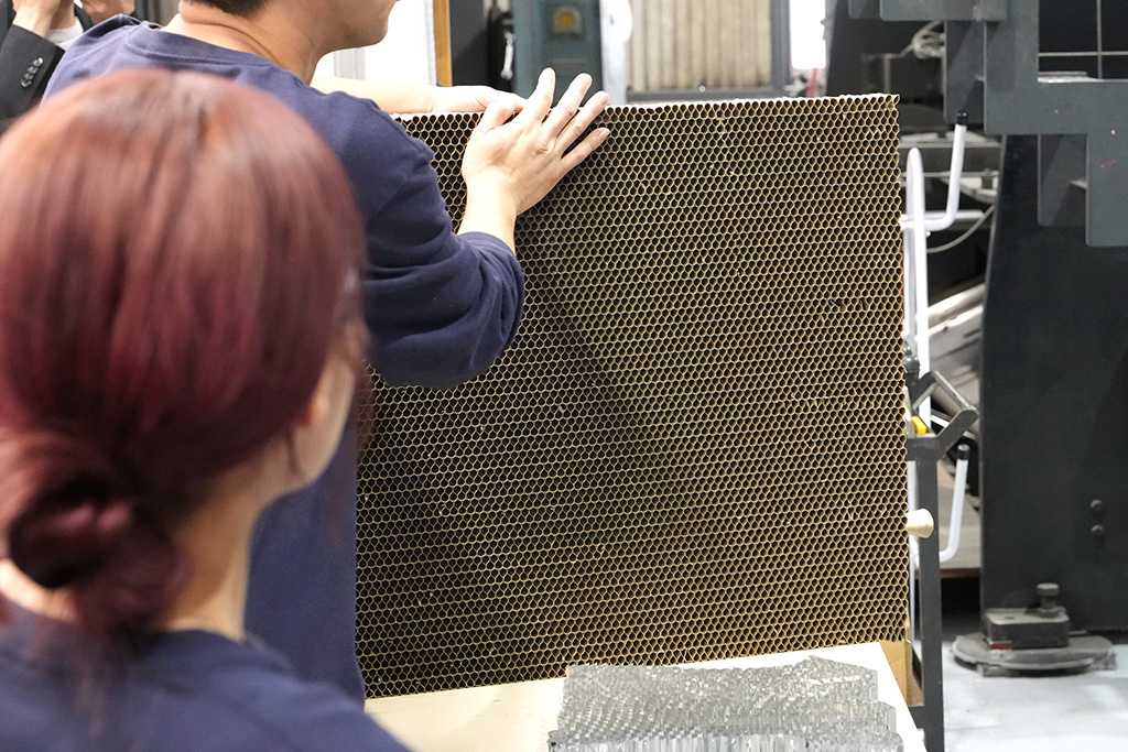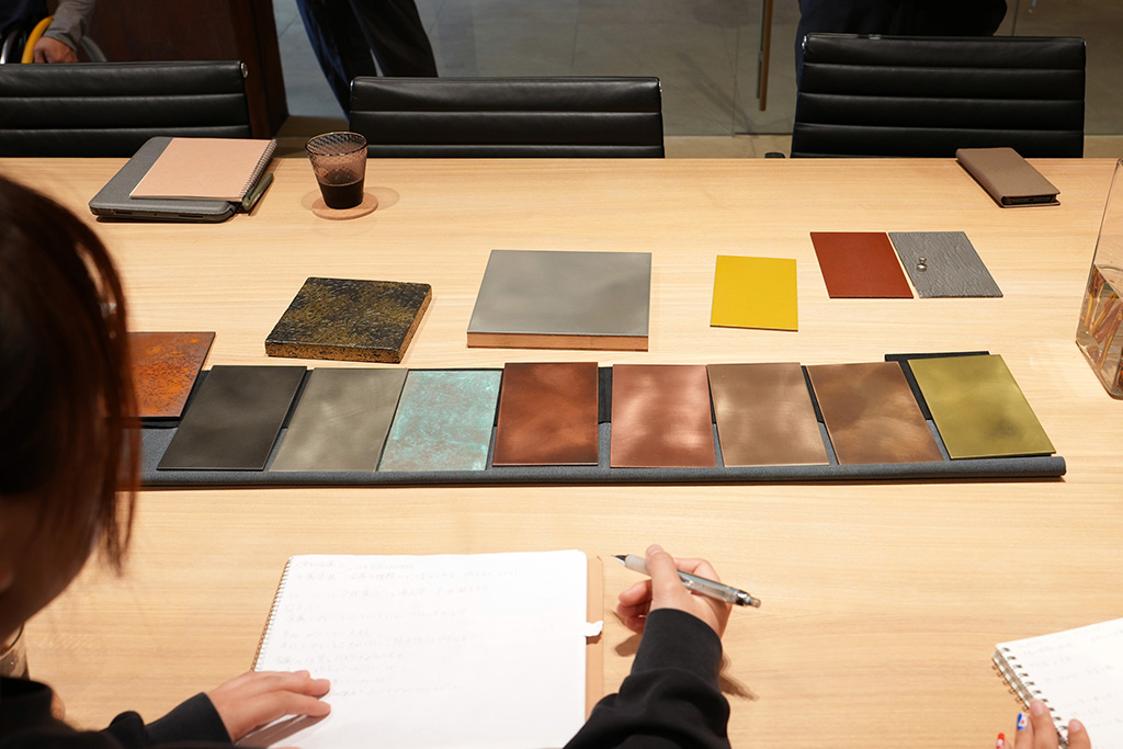 続く工場見学では、メタルサーフェス技術だけでなく、建築金属製品製造事業、アルミハニカムを用いた精密パネル製造事業、金属素材の販売事業など、アイチ金属が手がけるさまざまな分野の現場を見学しました。階段や手すり、カウンターなどを製造する重厚な鉄工場から、軽量で高い剛性を持つハニカム構造パネルの精密製造ラインまで、金属という素材の多様性と技術の奥深さを実感する貴重な機会となりました。