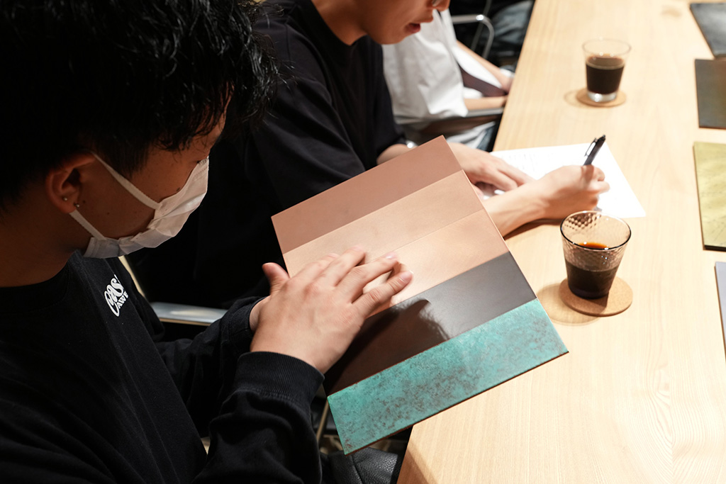 メタルサーフェス技術および液体金属塗料「Liquid Metal」については、製造部 部長の柏岡信喜さんと、研究開発を担当する川中冴恵さんよりご説明いただきました。お二人は本校のメタル&ジュエリーコースの卒業生でもあり、学生にとっては身近な存在でもあります。