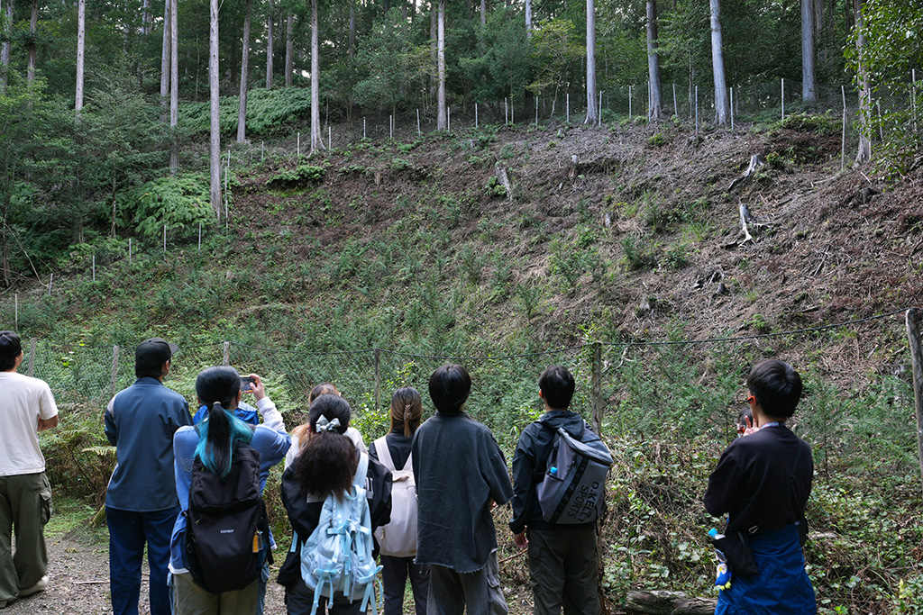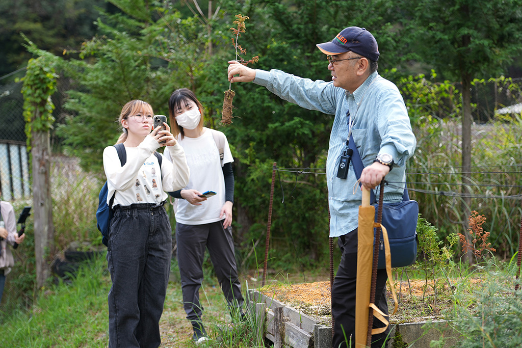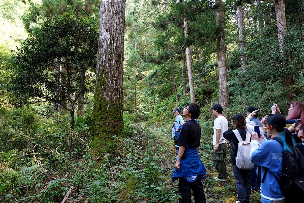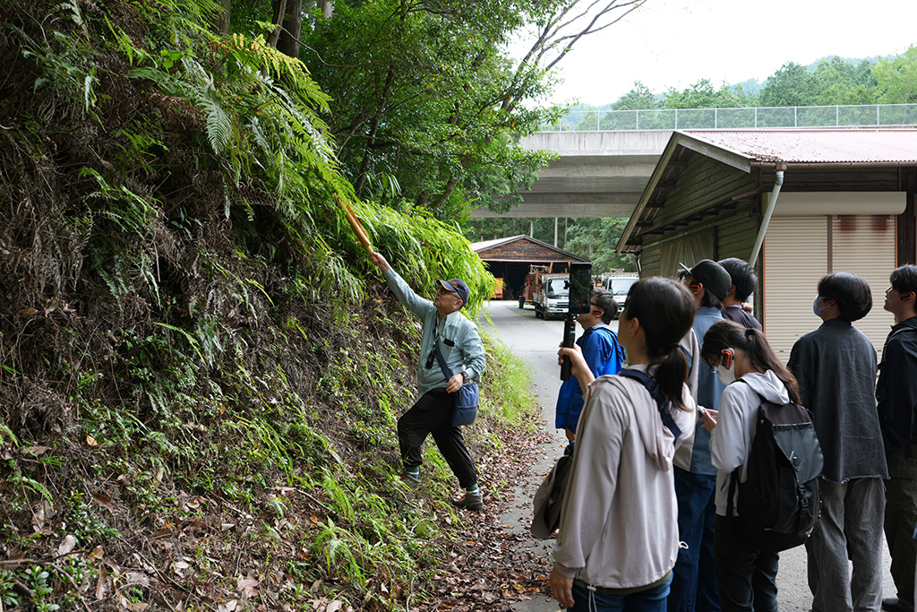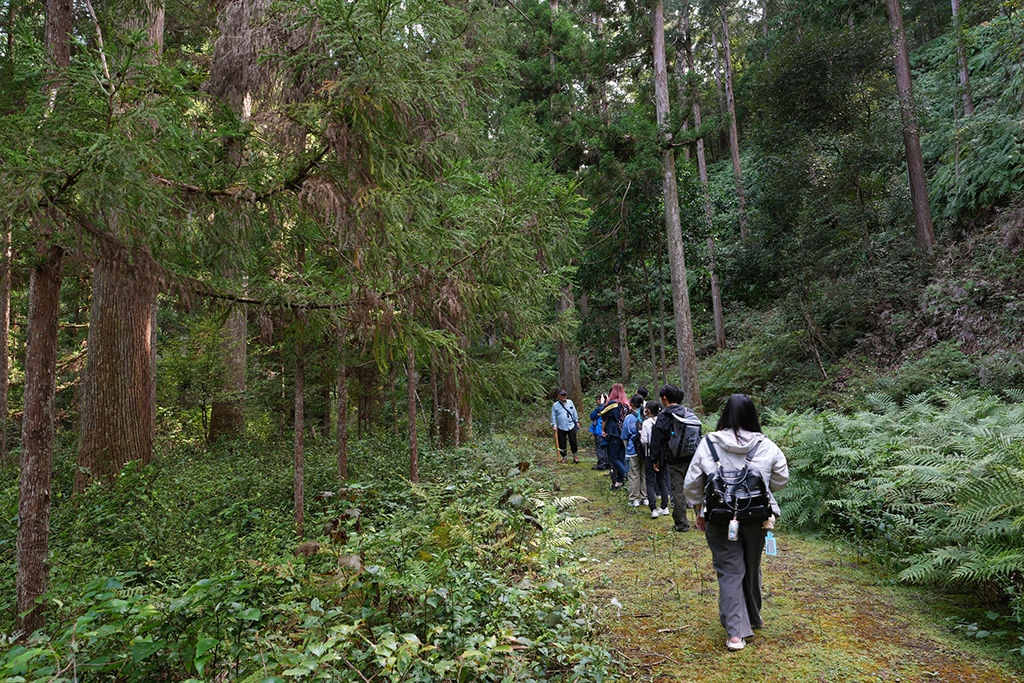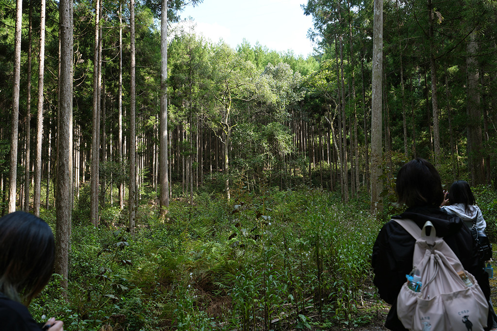 昼食後の山林見学では、ヒノキやスギの間に広葉樹が混ざる多様性豊かな森を歩きながら、速水さんが解説しました。針葉樹の間に自然に生えた広葉樹が土壌を肥やし、倒木や落ち葉が森を循環させていること。クスノキが防虫成分を備え、しなやかな枝で強風に耐えることなど、木々が持つ自然の知恵についても紹介しました。森の力を理解し、人間の営みと調和させていくことが林業の使命だと強調。学生たちは1時間半の見学を通じ、森林が単なる資源ではなく「生きたシステム」であることを実感しました。
