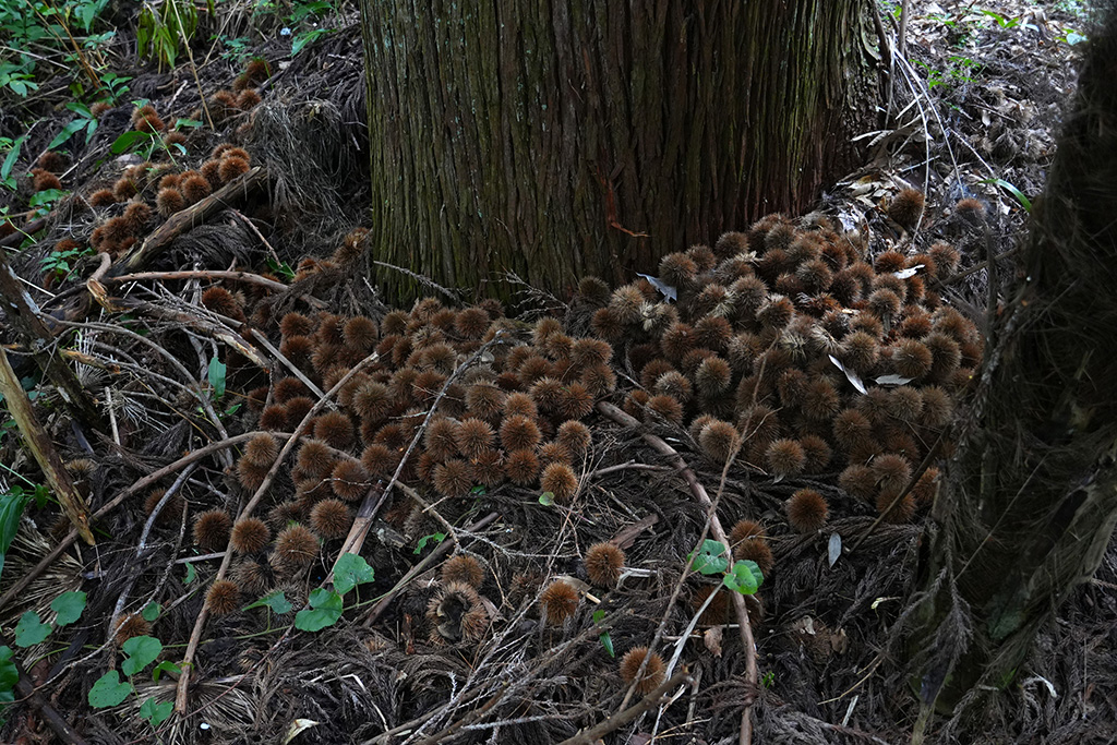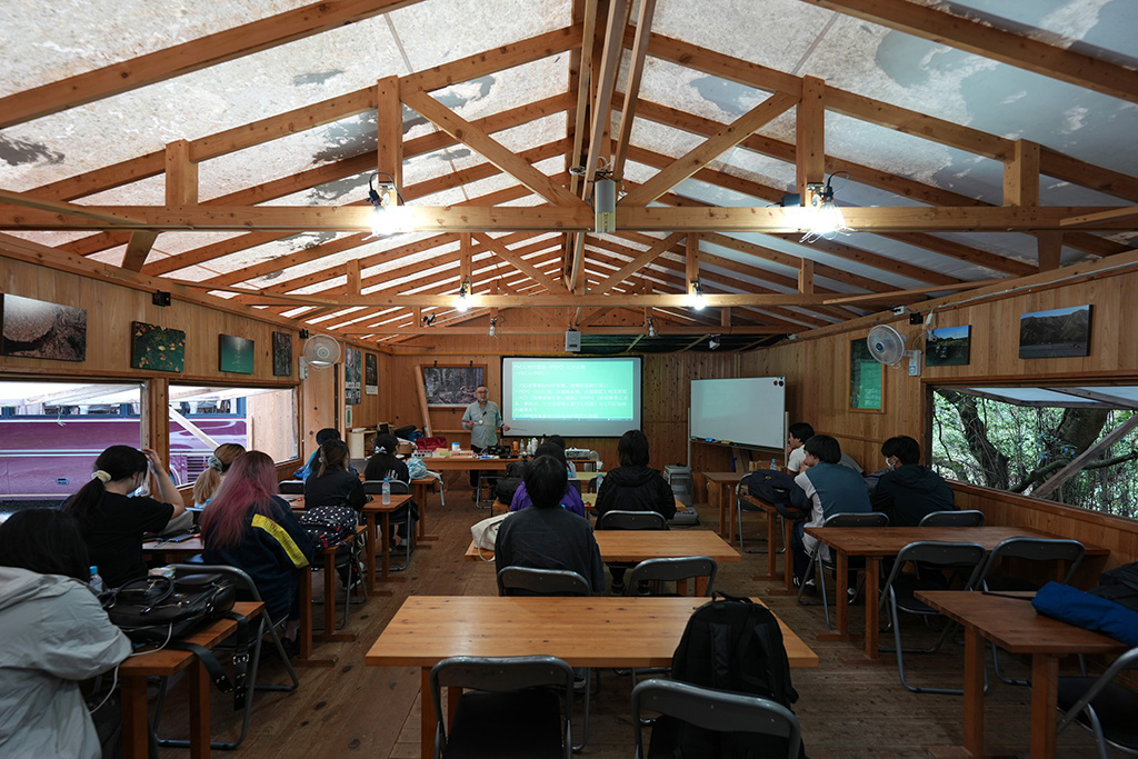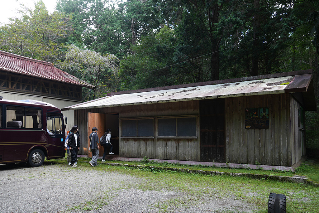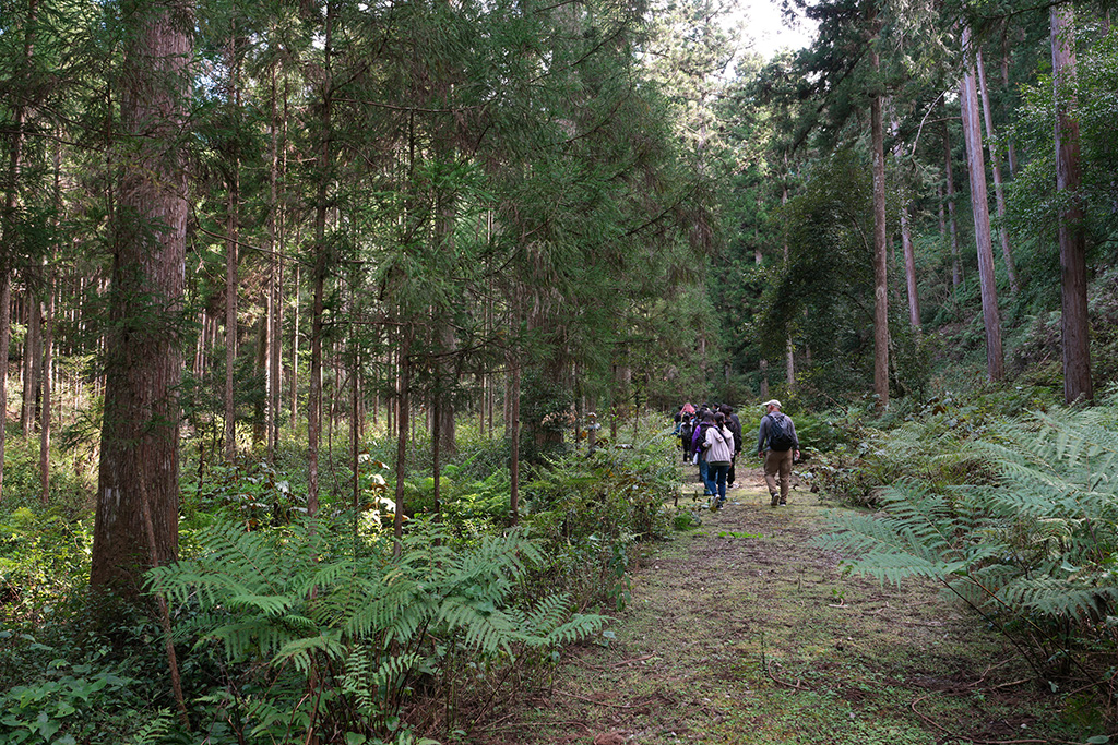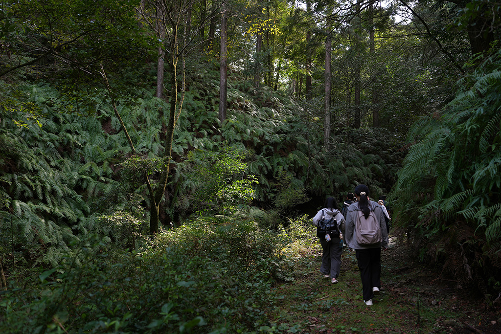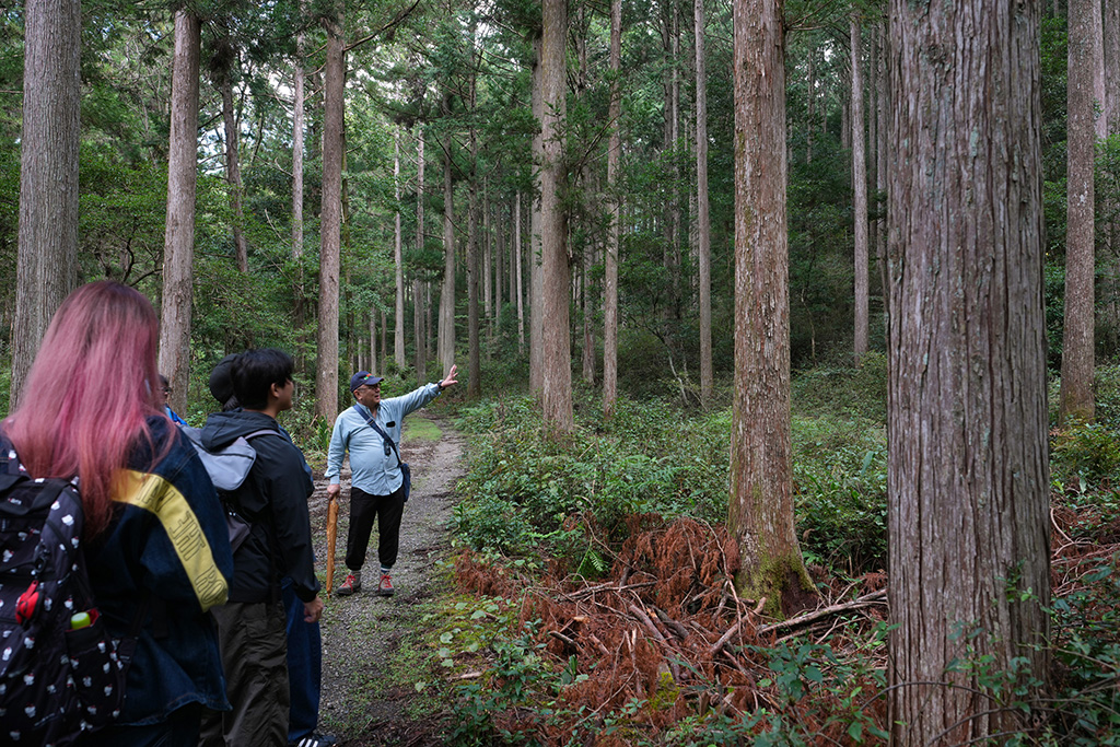 昼食後の山林見学では、ヒノキやスギの間に広葉樹が混ざる多様性豊かな森を歩きながら、速水さんが解説しました。針葉樹の間に自然に生えた広葉樹が土壌を肥やし、倒木や落ち葉が森を循環させていること。クスノキが防虫成分を備え、しなやかな枝で強風に耐えることなど、木々が持つ自然の知恵についても紹介しました。森の力を理解し、人間の営みと調和させていくことが林業の使命だと強調。学生たちは1時間半の見学を通じ、森林が単なる資源ではなく「生きたシステム」であることを実感しました。