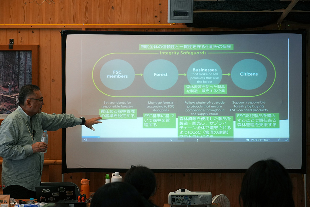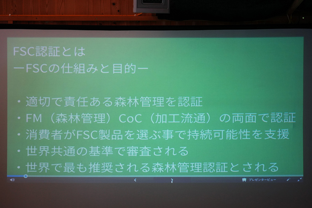 速水林業代表の速水亨さんからは、まずFSC認証について詳しい説明がありました。速水さんはFSCジャパン副代表を務めるほか、農林水産省林政審議会委員、三重県林業振興対策審議会委員、森林組合おわせ組合長、環境省中央環境審議会臨時委員や(社)日本林業経営者協会会長などを歴任。日本の林業政策や環境行政をリードしてきた人物です。