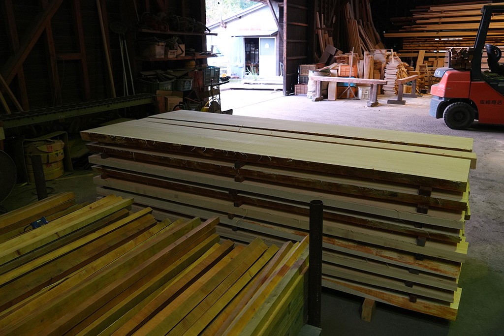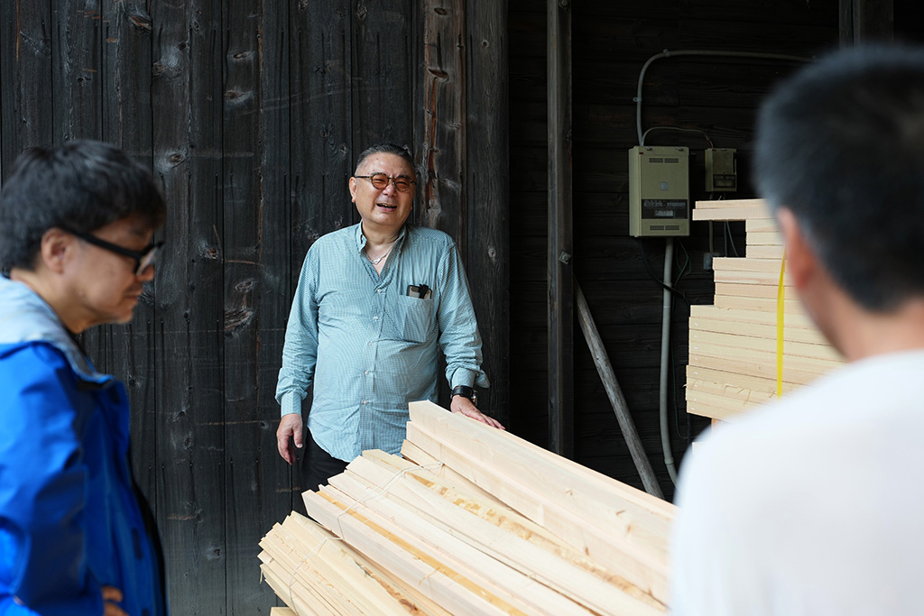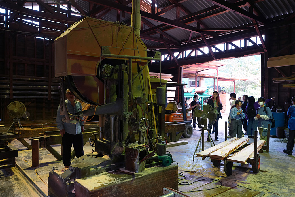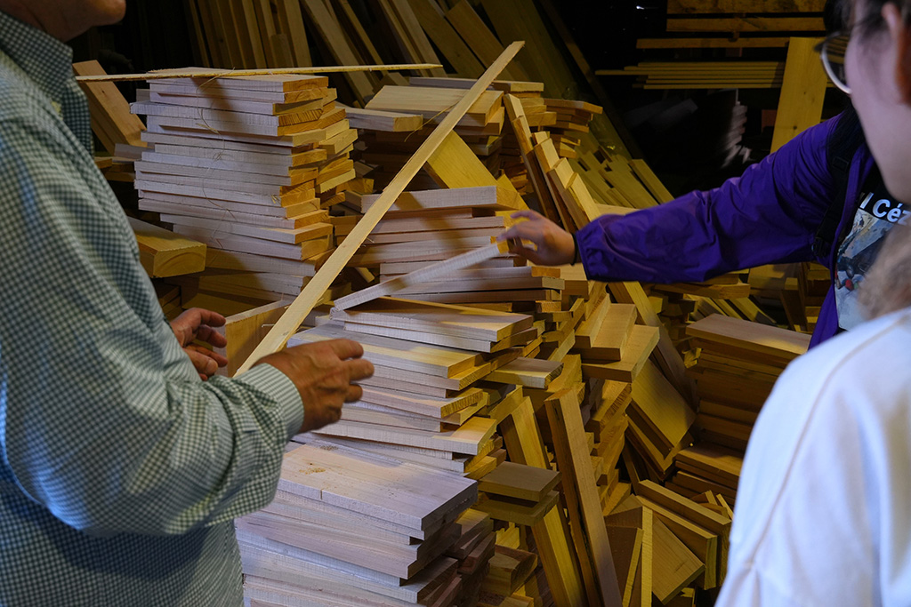 その後、速水林業と連携する製材所・塩崎商店を訪問。ここでは木の切り方や枝の状態が材質に与える影響、節の少ない材をつくるための植林や間伐の工夫などについて学びました。塩崎商店では市場に流すだけでなく、注文に応じて山から最適な材を選び、製材所と山側が密に相談しながら提供する仕組みを整えています。京都や鳥羽のホテルからも最高級ヒノキ材の注文があり、地域の森林資源が建築や内装に活かされています。学生たちは創作に使える端材を分けてもらい、木材の手触りや重みを体感しながら、自身の表現へつなげるきっかけを得ました。