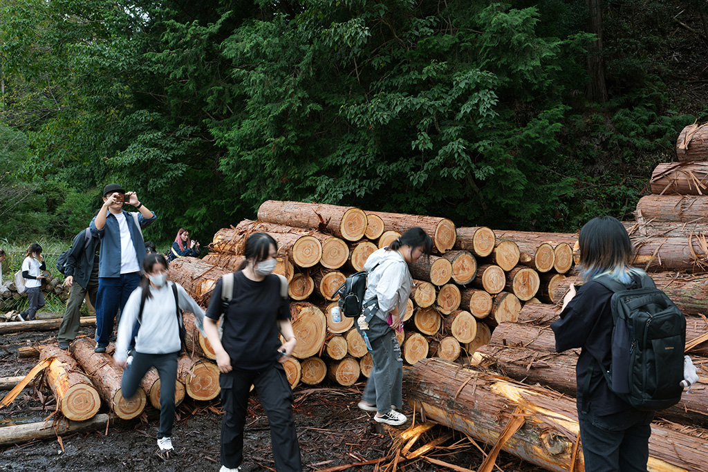 2025年10月1日、学生たちは三重県の速水林業を訪問しました。同行したのはコーディネーターの西埜さんと、FSCジャパンの白井聡子さんです。白井さんは「普段は企業(BtoB)に向けた活動が中心で、一般消費者に直接アピールする機会はあまりありません。学生の皆さんからどんなアイデアが出てくるのか、とても楽しみにしています」と語り、今回の試みに期待を寄せました。