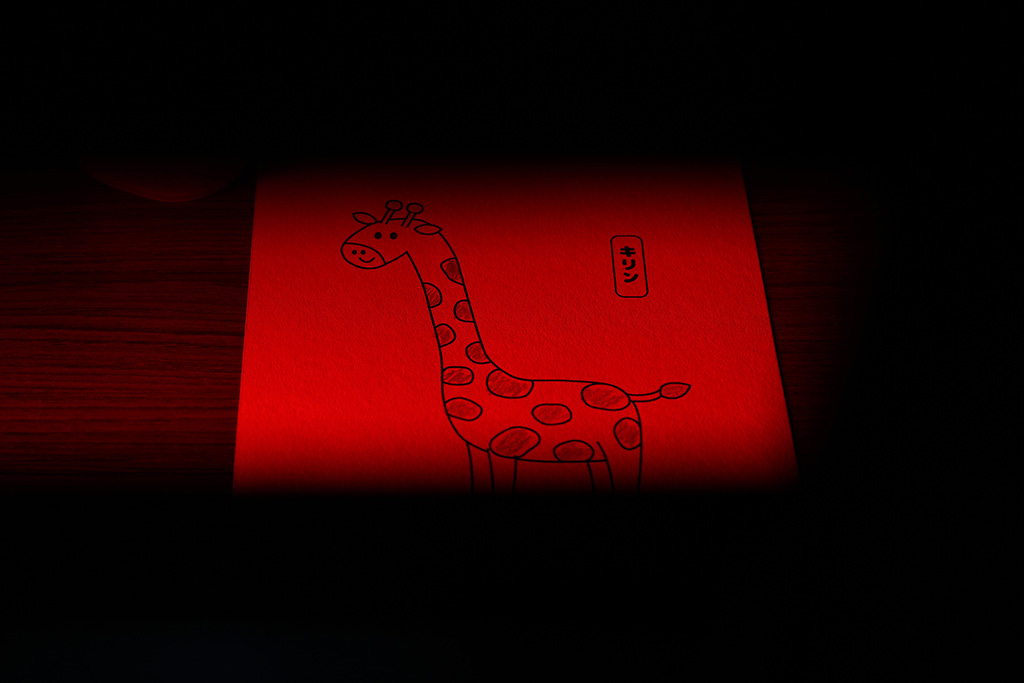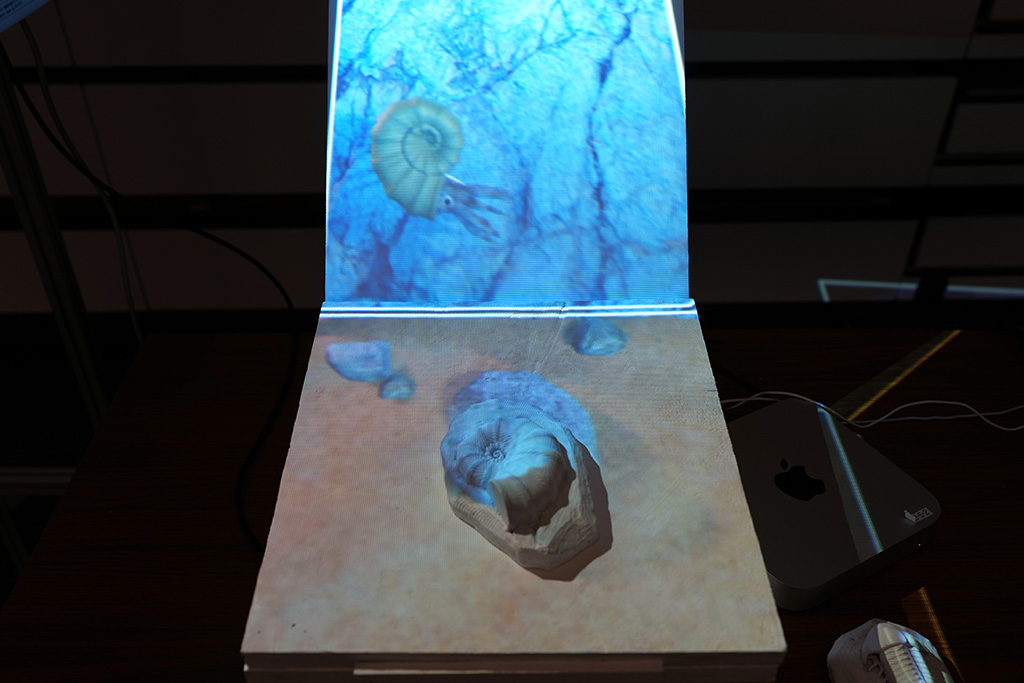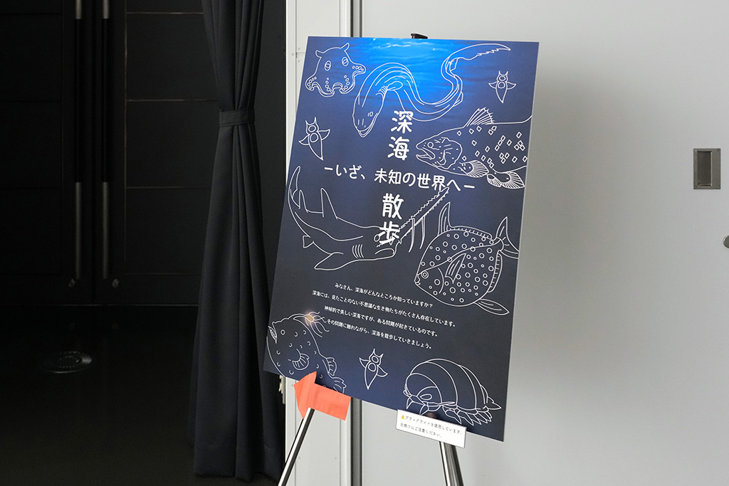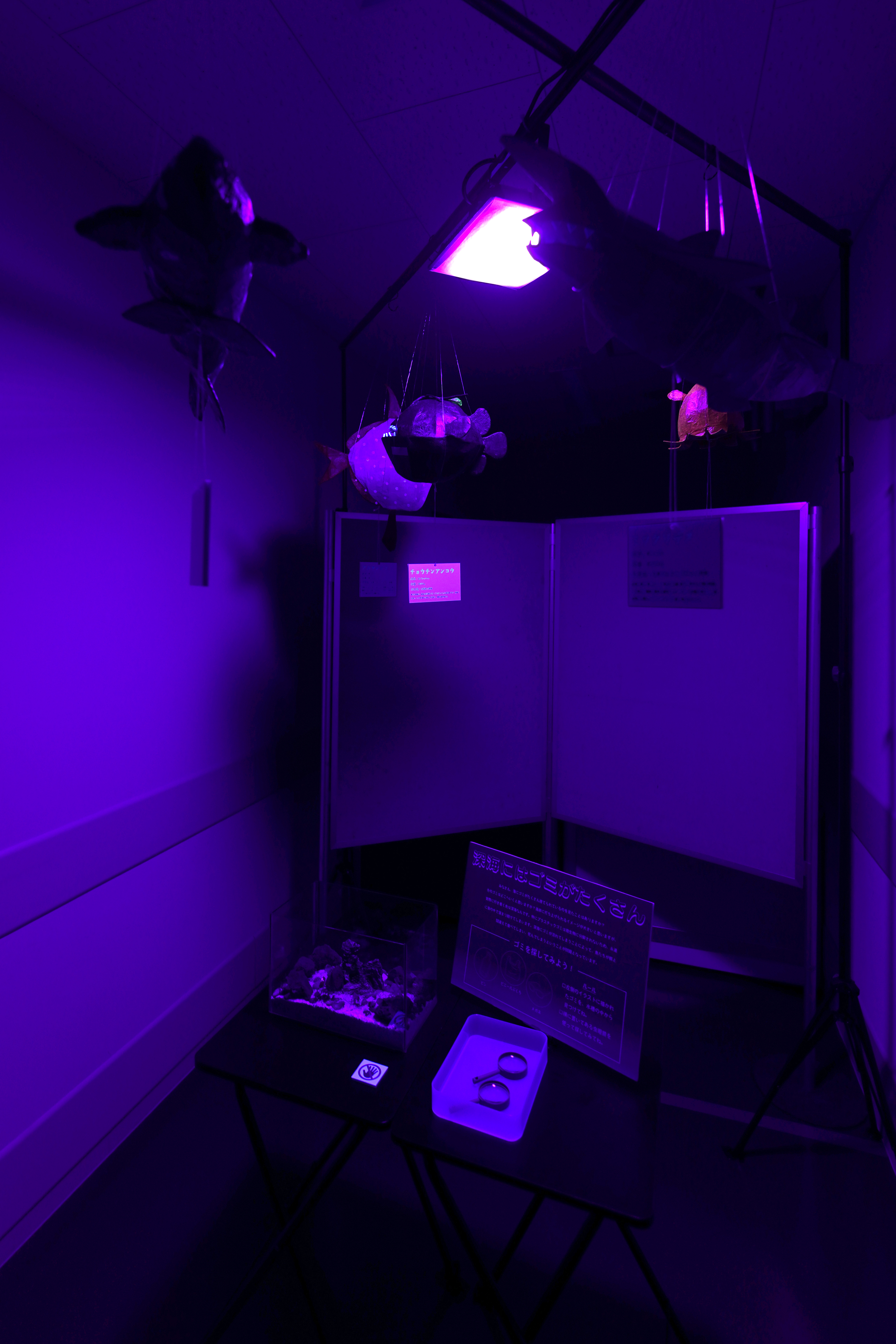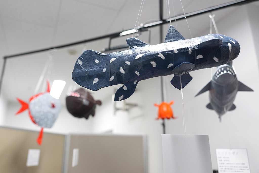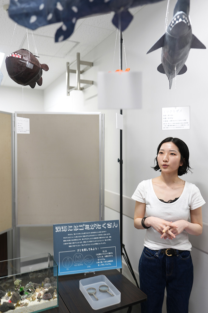 寺本和奏さんの作品「深海散歩 ―いざ、未知の世界へ―」は、暗室を使った空間インスタレーション。吊るされた深海生物の模型とジオラマで深海を再現し、ブラックライトを当てると光る蛍光塗料によって、暗闇に幻想的な世界が浮かび上がります。虫眼鏡を使って深海に潜むゴミを探す仕掛けもあり、環境問題にも目を向けた作品です。寺本さんは「造形に挑戦してみたくて、段ボールと紙だけで深海生物を作りました。時間はかかりましたが、空間ごと“深海”を表現できたと思います」と話しました。