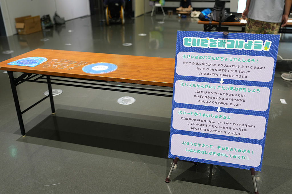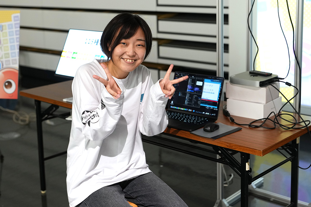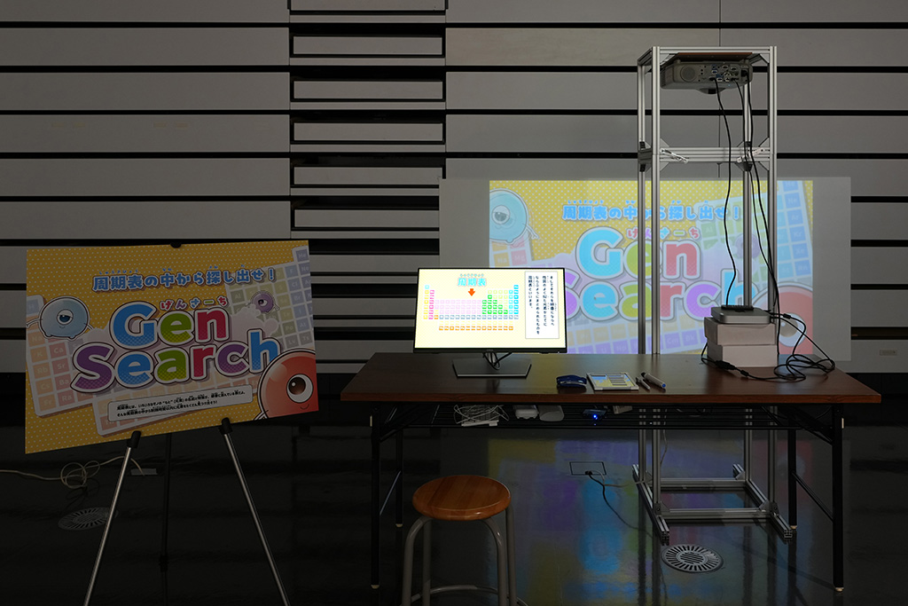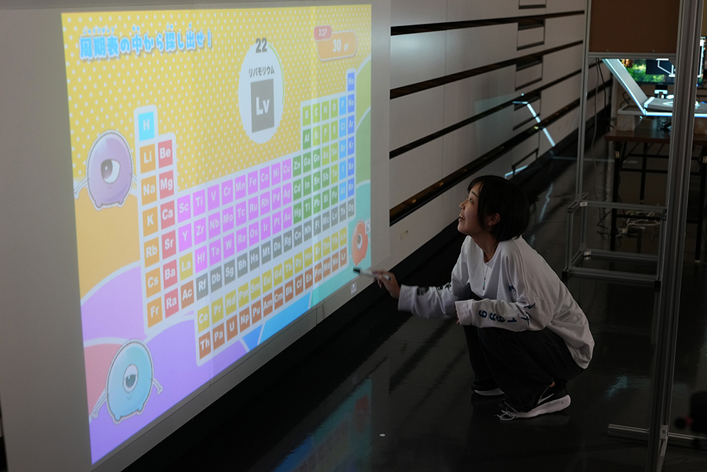 北村菜々さんの作品「周期表の中から探し出せ! Gen Search」は、元素周期表をテーマにしたゲーム作品。北村さんは「周期表の並び方がすごく美しいと思っていて、それを小さな子にも感じてほしかった」と話します。画面に映し出された元素を探し出すアクションゲームで、遊びながら化学の世界に親しめるようになっています。子どもたちに大人気で、何度も挑戦する参加者も多く、会場は笑顔と歓声に包まれました。「こんな大きな会場で多くの人に自分の作品を体験してもらえるのはとても嬉しいです」と北村さんは語りました。