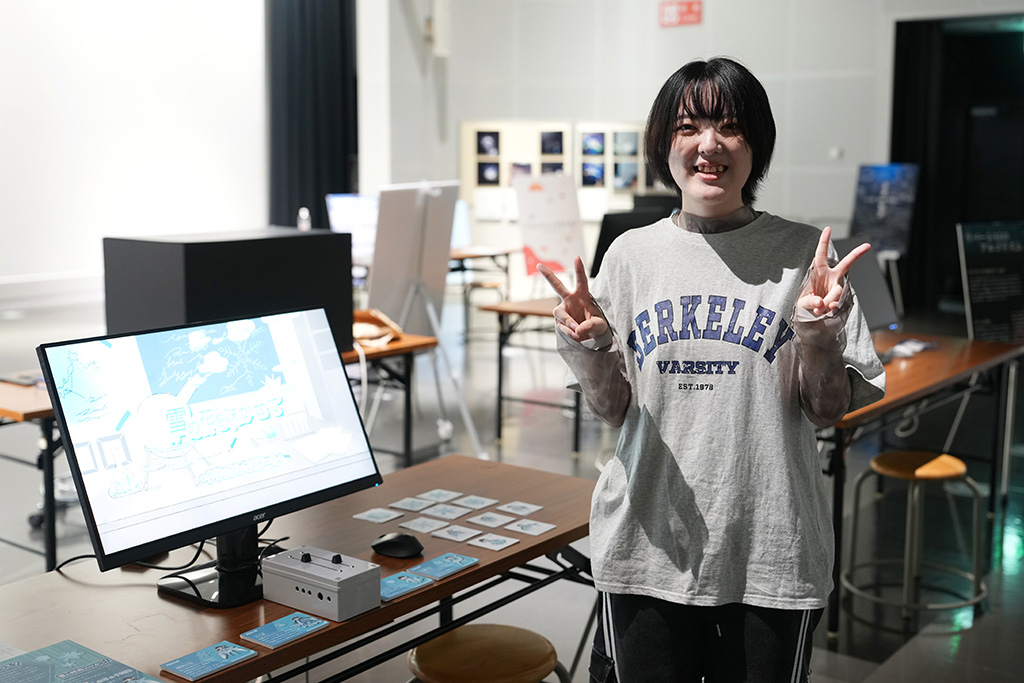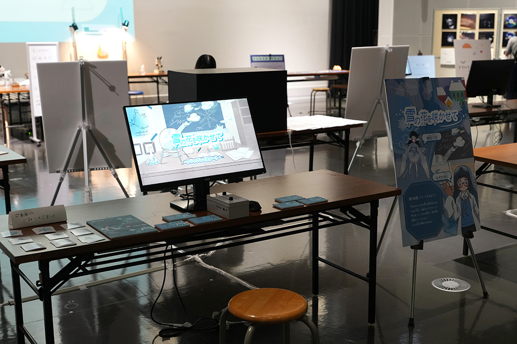永水彩花さんの作品「雪の花を咲かせて」は、温度と水蒸気量をコントローラーで設定すると、その条件で生成される雪の結晶を表示する作品です。生成された雪の結晶には、それぞれ異なるキャラクターがデザインされており、体験者にはそのキャラクターのステッカーが配布されました。永水さんは「プログラミングで自然現象を再現したいと思いました。条件を変えると結晶の形が変わるところが科学的で面白いと思います。子どもたちが操作しながら“雪の研究者”のように楽しんでくれて嬉しかったです」と語りました。