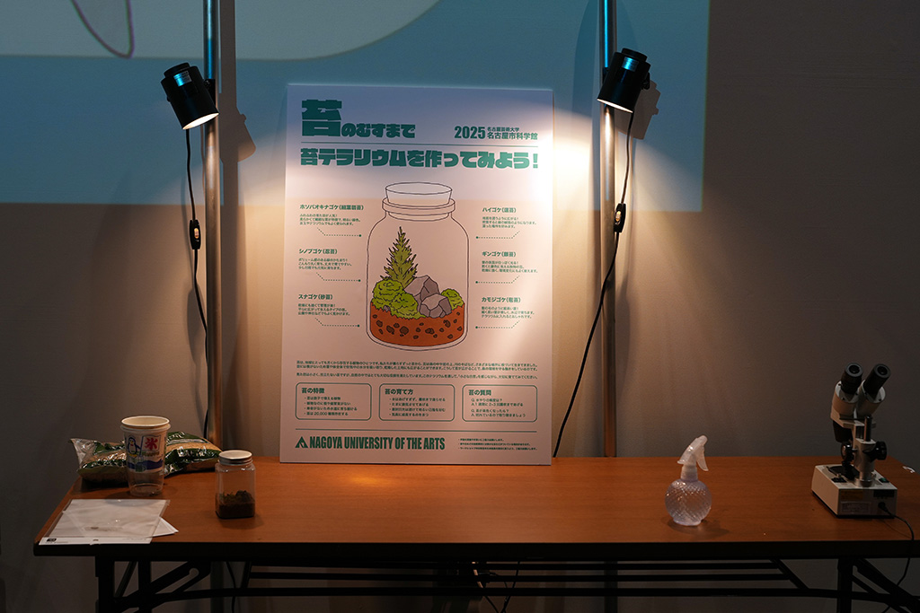 デザイン領域先端メディア表現コース3年生は、名古屋市科学館とコラボレーションし、「メディアアートで科学の魅力を伝えてみた!」を開催しました。2025年10月4日(土)・5日(日)の2日間、名古屋市科学館 生命館地下2階サイエンスホールにて、学生たちが制作したメディアアート作品を展示。工作や実験を通して科学の楽しさを体験できる「青少年のための科学の祭典(名古屋大会)」と同時開催され、親子連れを中心に多くの来場者でにぎわいました。