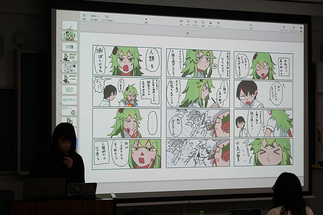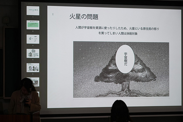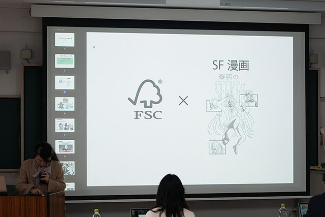 最終プレゼンテーションには、FSCジャパン事務局長の西原智昭さん、マーケティング&広報マネージャーの河野絵美佳さん、プロジェクトをコーディネートした西埜隆文さん、そしてイラストレーションコース卒業生でマンガ家として活躍し、本学教育学部「アトリエ・コモンズ」の助手も務める徳本夏奈子さんが講評者として参加しました。