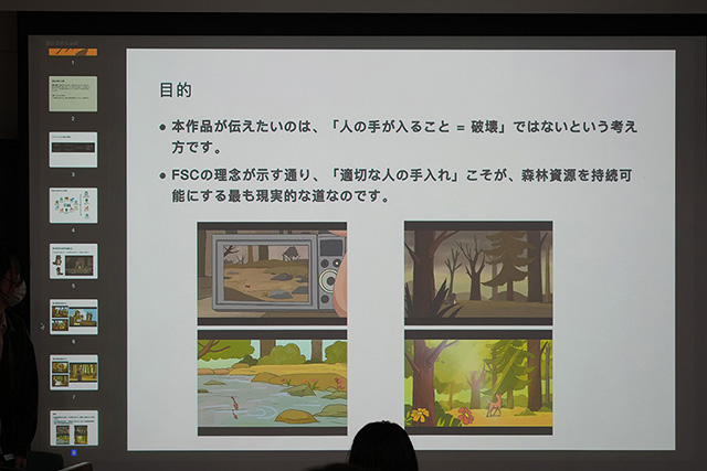 マーケティング&広報マネージャーの河野さんからは、「最初にこの企画をいただいたとき、正直、FSCのような難しいテーマをマンガやアニメでどう伝えるのか、まったく想像ができませんでした。しかし今日、皆さんの発表を聞いて『ここまでできるんだ』と本当に驚きました。私たちの普及活動にとっても、非常に参考になる視点や切り口が多くありました。完成した作品を、ぜひ今後も共有してほしいですし、また一緒に何かできる可能性も感じています」と、今後への期待が語られました。