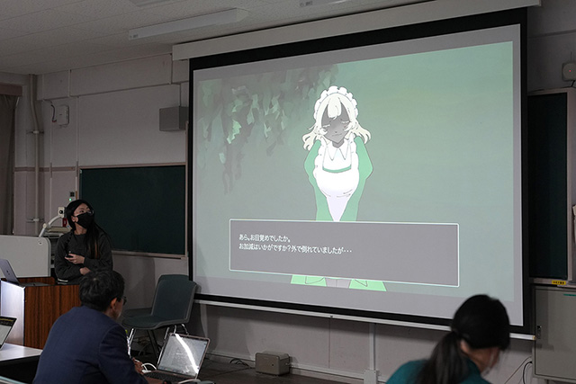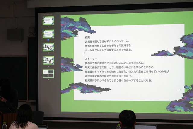 発表された作品は、絵本やアニメーション、小説、ゲーム、Webサイト、さらには多様な展開が可能なキャラクター開発など実に多彩で、子ども向けにやさしく伝えるものから、社会問題として深く掘り下げた表現まで幅広い内容となりました。SFやホラーといったジャンルを取り入れた作品、SNSでの拡散を意識した構成など、現代のメディア環境を強く意識した点も印象的でした。伝える相手を明確に設定し、それに応じて媒体や表現方法を選択していることが随所に見られ、実践的なコンテンツ制作として高い完成度を示していました。