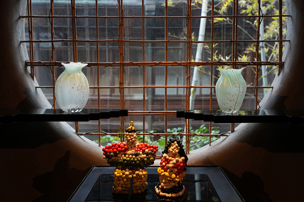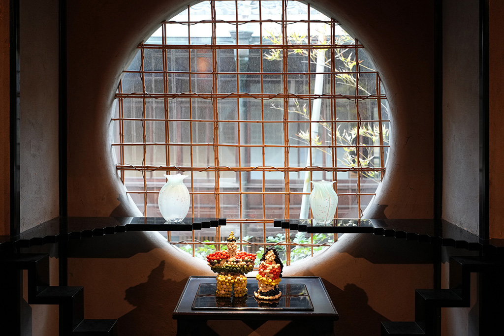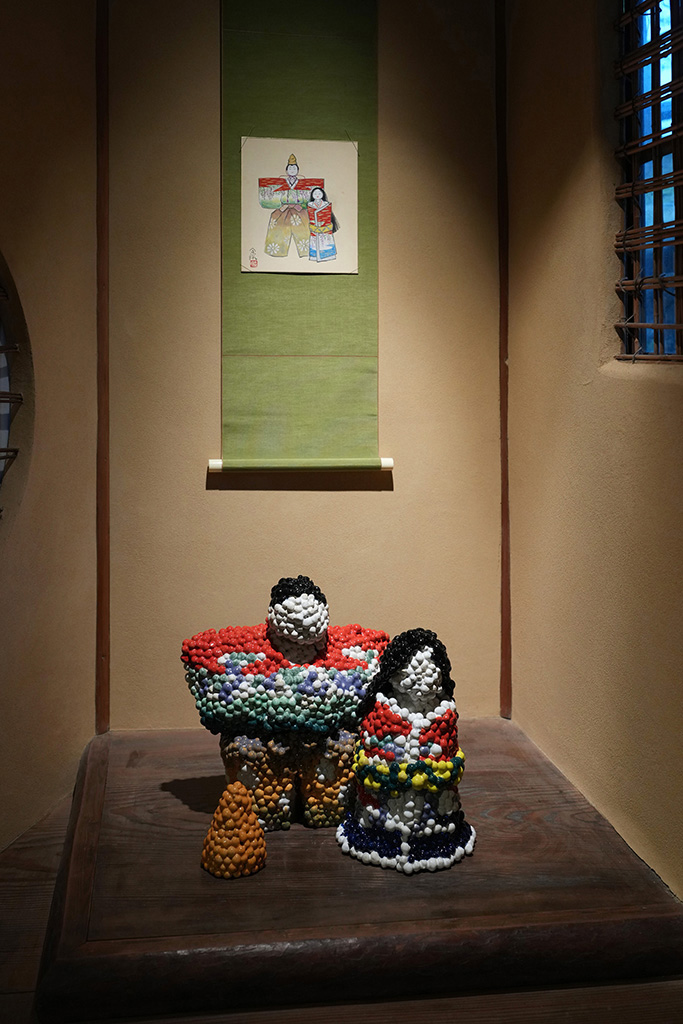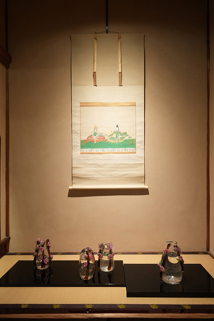 4回目となる今回は、これまでの「爲三郎記念館から構想を練る」という方法に加え、季節に合わせた古川美術館所蔵の「桃」や「雛の節句」に関わる作品を展示し、学生作品と競演させるという新たな要素が加わりました。学生たちは、収蔵品との関係性を意識しながら、自身の作品を構想。伝統と現代表現が響き合う、贅沢な展示空間が生まれました。