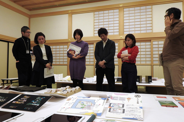 講評は、学生ひとりひとりが作品について説明し、それに対して意見を伺いました。子どもや外国人にもわかりやすく伝えられることや、さまざまなアイデアが提示されたことを高く評価いただきました。名古屋市観光文化交流局 吉田氏からは「着眼点の良さ、作品のできばえにも驚きますが、学生のみなさんが、一所懸命調べて名古屋城のことを思ってくれています。そのことが作品から伝わってきて、すごく嬉しいです」との言葉をいただきました。また、日頃から歴史的な価値をどうやって伝えていくか腐心していることや、いくつかのアイデアはぜひ実現したいと、関係者ならではの発言もあり非常に有意義な講評会となりました。