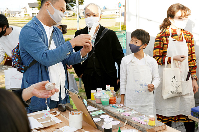 そして最終日である11月29日(日)はとても良いお天気の中、いよいよお店がオープンです。当日ぎりぎりまで頑張って準備したお店に、お父さんやお母さん、お友だちも集まり、お店の無事オープンをお祝いしてジュースで乾杯!さぁ販売スタートです。お客さんに商品の説明をしたり、値段の交渉やお会計も全部自分たちで行いました。