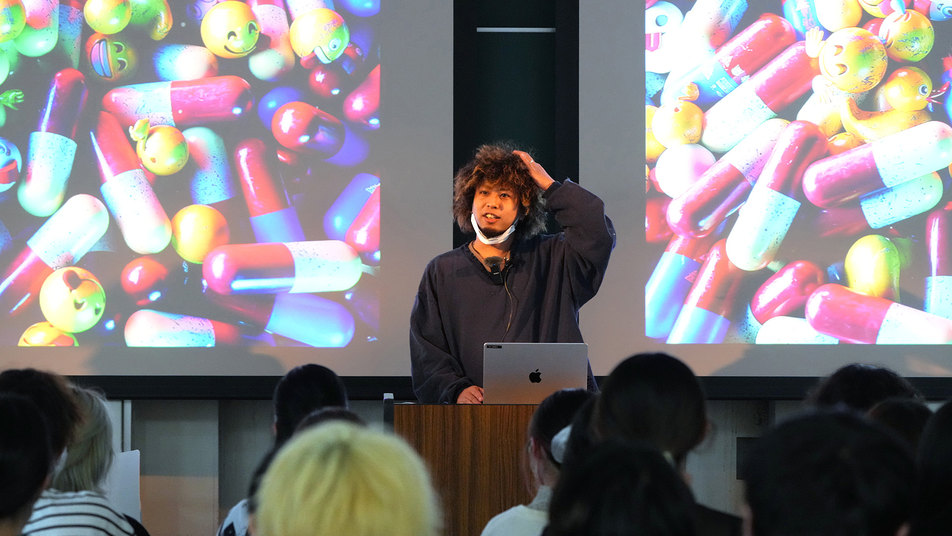 OSRIN氏は、再生回数4億回を上回るKing Gnu「白日」のMVをはじめKing GnuのほとんどのMVを手がけ、King Gnuの常田大希さん率いるクリエイティブ集団「PERIMETRON(ペリメトロン)」の一員として活動。現在では映像作家、グラフィックデザイナーとして、millennium parade、Mr.Children、GLAY、櫻坂46など数々のアーティストのミュージックビデオやアートワーク作品を手がけています。学生からの注目度も高く、ライフスタイルデザインコース、映像制作に大きく携わる先端メディアコースの学生はもちろん、東キャンパスから音楽領域の学生も大講義室に詰めかけました。